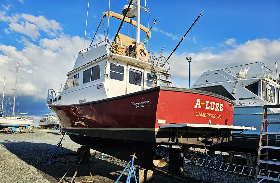 A-LURE is a great example of a very rare Eastern Casco Bay 35. With her beautiful burgundy "Awlgriped" hull and flybridge make here stand out in the crowd. She has a modified deep-V hull and single engine lobster boat design making her a nice performing, fuel efficient yacht. Her current owners have both fished a lot and just completed the "Great Loop" so her air draft is low enough for that trip. Her cockpit is quit large with built in 7 draw tackle box beneath the flybridge ladder, fish box under the sole with pumpout, livewell built into the transom and a small door providing indoor rod storage. When fishing there are 8 gunnel mounted rod holders, 10 ladder mounted and outriggers.
