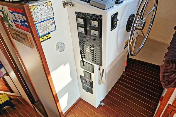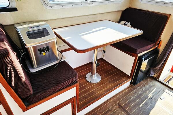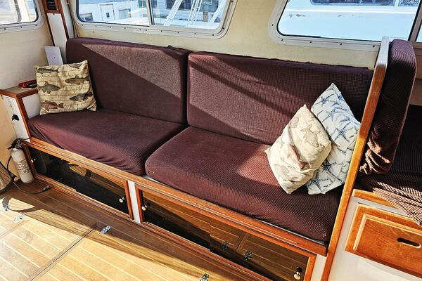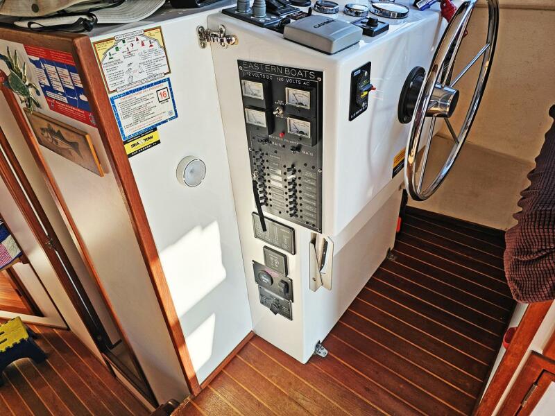 Entering the cabin the layout is a simple, straight line design with settee on the port side that folds out to make a double berth and has doored storage beneath. At the forward end of the settee is located a forward facing companion seat. On the starboard side there is a two person table that converts to a single berth with storage beneath forward seat is storage and the aft seat a refrigerator. Forward of the dinette is the helm station which has the ability to tilt back for full accessibility to wiring, steering and throttle controls. The panel has full instrumentation for both navigation and a full array of analog engine gauges. On the inboard side of the helm are located both the 12v. and 120v. breaker panels.