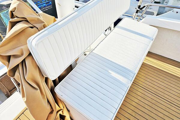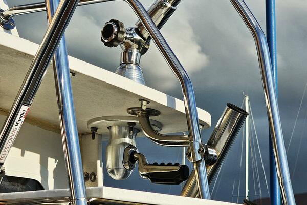 Now, up the ladder to the flybridge. This is a nicely designed ladder with very wide, deep steps with a good handrail that angles forward at the top making for good flybridge access and great all round visibility. Once up there the bridge decking is newly installed fake teak providing a great footing and nice custom look. Seating is provided with two "Todd 1500" helm chairs and a bench seat with back rest and storage inside. For sun protection there there is a collapsible bimini with boot when not in use. For all antenna's there is a radar tower located behind the bench seat and 6 more rail mounted rod holders.