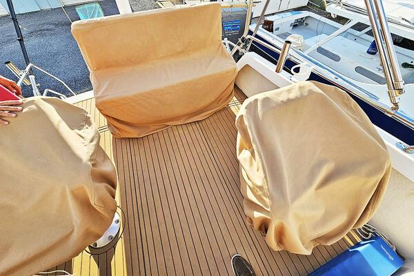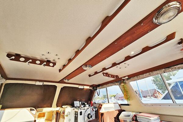 Cabin sole through out the yacht is teak and holly plank with teak trim used through-out. The salon overhead has two full length handrails as well as two (6) loop rod holders