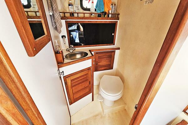 To head is located to starboard and just forward of the helm. This is quite large for a 35' lobster boat. There is a good size counter which has a oval, stainless steel sink and ample storage both above and below, just forward of this a separate stall shower with a teak seat, and the toilet is a Vac-U-Flush unit.
