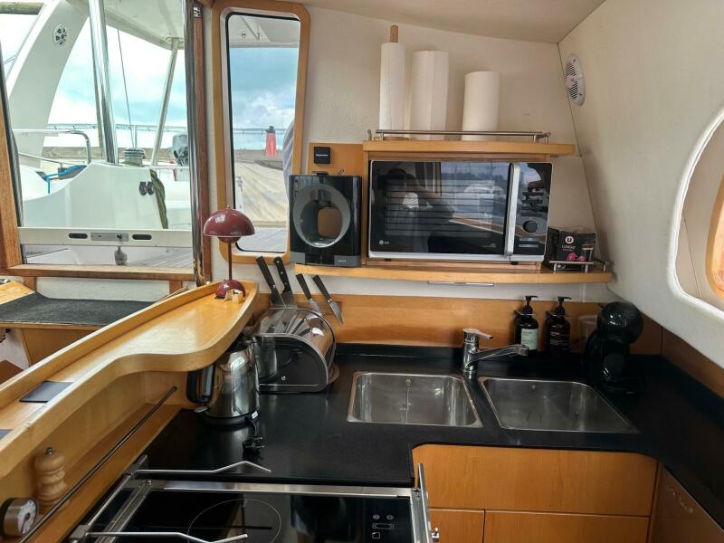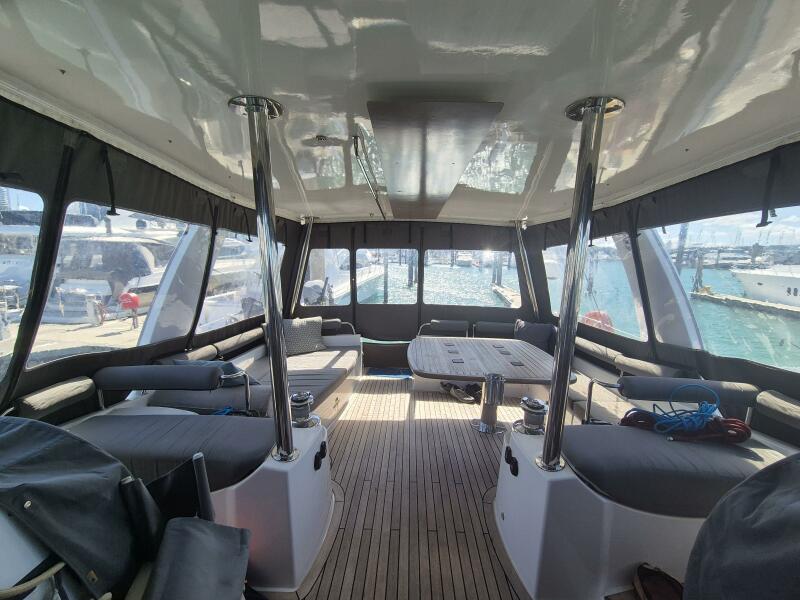 Designed with practicality and safety in mind, Elvira features a retractable centreboard keel and twin rudders for excellent versatility and control. Her spacious deck layout offers a large centre cockpit with twin helm stations, sun protected cockpit with hard top Bimini, plus a generous aft deck complete with boarding platform, dinghy davits, outboard lifter and hydraulic passerelle.