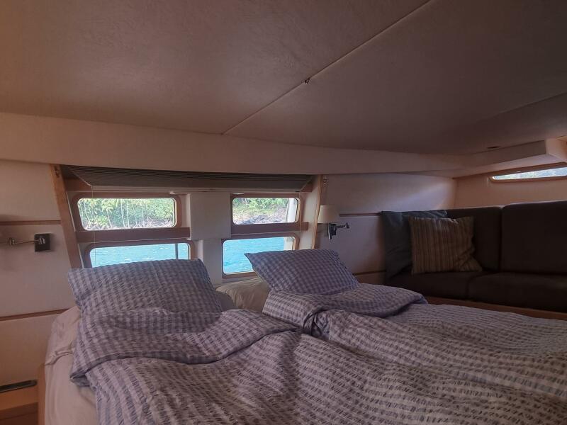 Below deck, Elvira boasts a bright and inviting interior with a three-cabin, two-head layout. The raised pilothouse houses the galley to port and a comfortable saloon and navigation station to starboard, offering panoramic views and natural light. Forward, you’ll find a double cabin, bunk cabin and additional head, while aft lies a luxurious full-width master cabin with private ensuite.