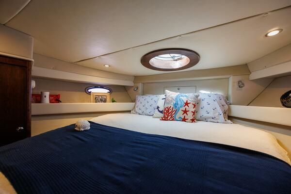 Panoramic View with an abundance of headroom is the first thing you notice as you step inside through the sliding doors from the cockpit. She’s tastefully decorated with wood like flooring with removable panels for extra engine room access. There is an L shaped Ultra Leather Sofa, two casual chairs, Flat Screen TV with wine chiller & ice maker on the port side. Guest and Owners will appreciate the single level approach with this design and ease of access from swim platform to cockpit to salon.
