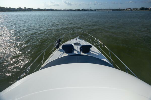 - The flybridge’s distinctive overhang offers more space topside as well as cockpit weather protection, and its molded-in steps are hinged to provide direct engine-room access.