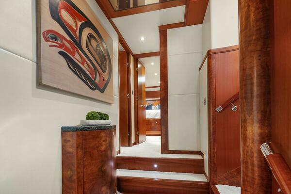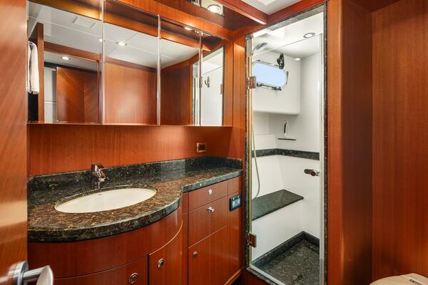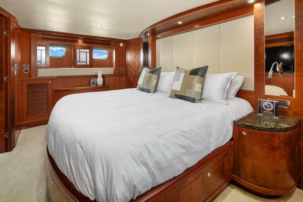ESTANCIA sleeps eight guests with 3 state rooms, plus 2 crew cabins. At the bottom of a lovely, curving staircase is a welcoming foyer leading to a sprawling full-beam master stateroom located midship. Boasting custom Sakura cabinetry, the master stateroom features a large cedar-lined full-height hanging locker, plus larger second master closet with a concealed safe inside. A massive bureau, an elegant vanity table, and nightstands are all finished with beautiful gloss and are large enough to accommodate short weekend trips and extended cruises alike. The king-sized berth conceals additional storage beneath. The master suite includes a richly appointed head configured with his-and-hers sinks. A grandly scaled shower, custom hardware, and rich Sakura cabinetry complete the accommodations. Privacy port lights and mirrors ensure the space is light and airy. New Tempur-Pedic mattress.