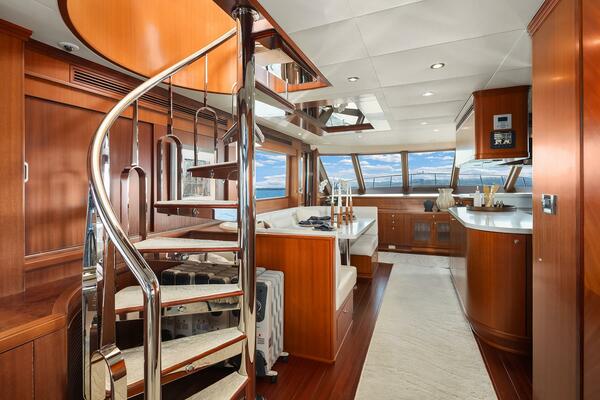The lavish sky lounge is excellently appointed as an inviting command post suited for all to enjoy while cruising. The double-seated helm includes an oversized, sunken, and extended dash for the best suited instrumentation layout. A portside day head and starboard-side curved settee and table allow for comfort while underway. The upper aft deck features a barbecue and an additional wet-bar. A heavy-duty davit is located to starboard for storing the tender and any additional toys.