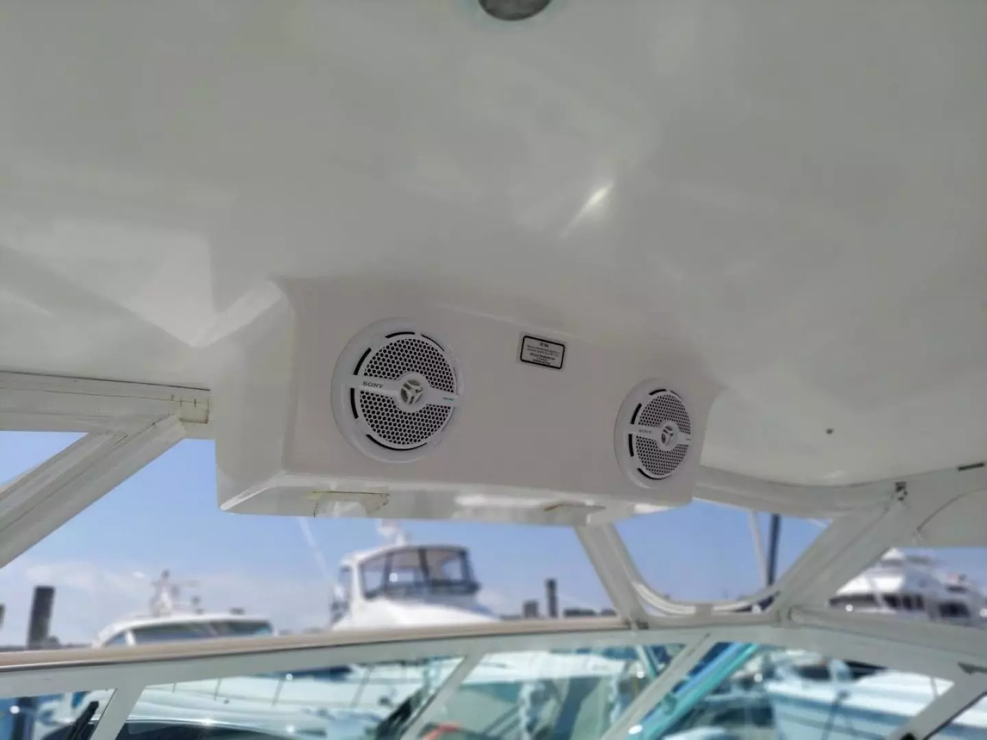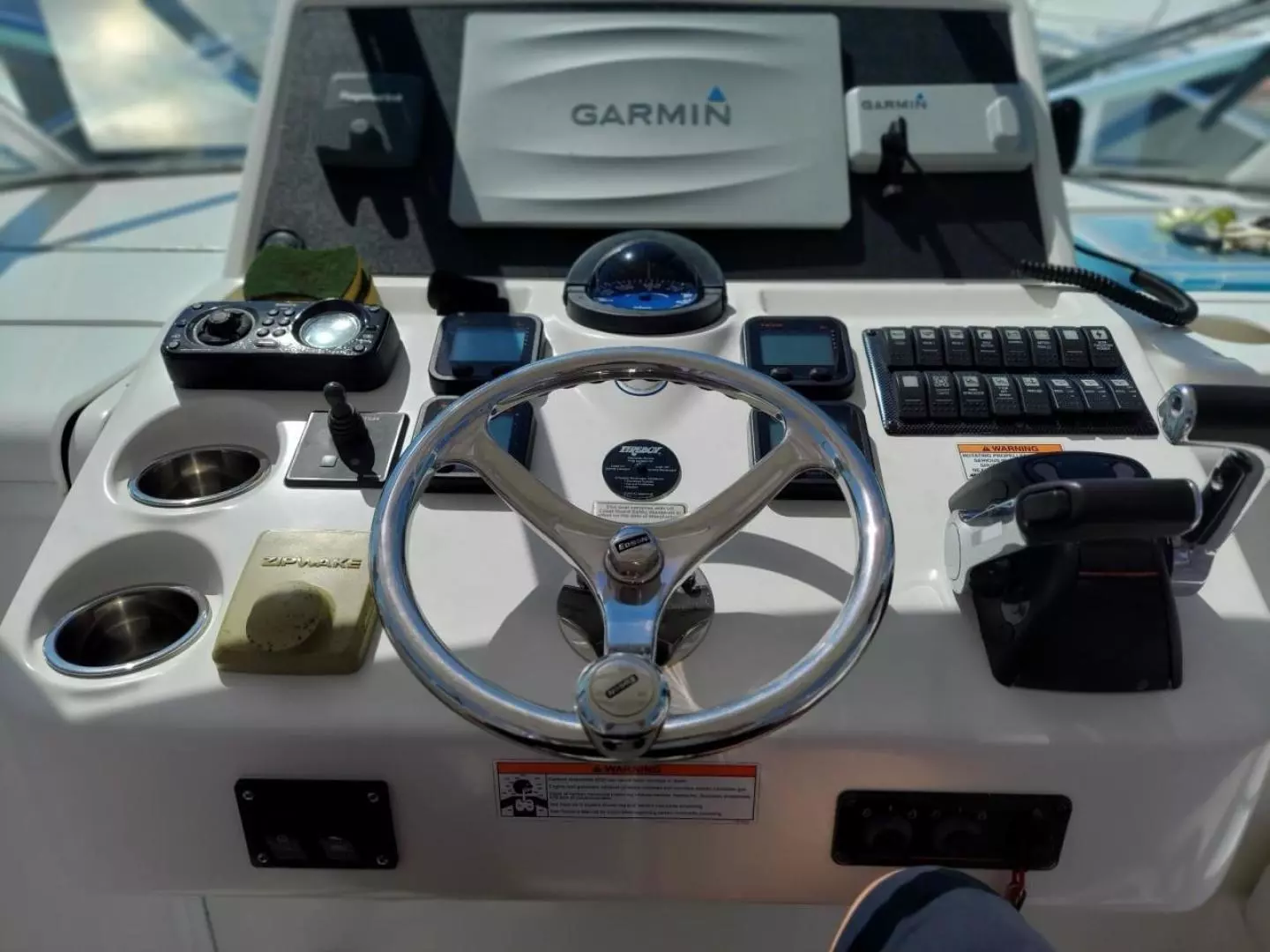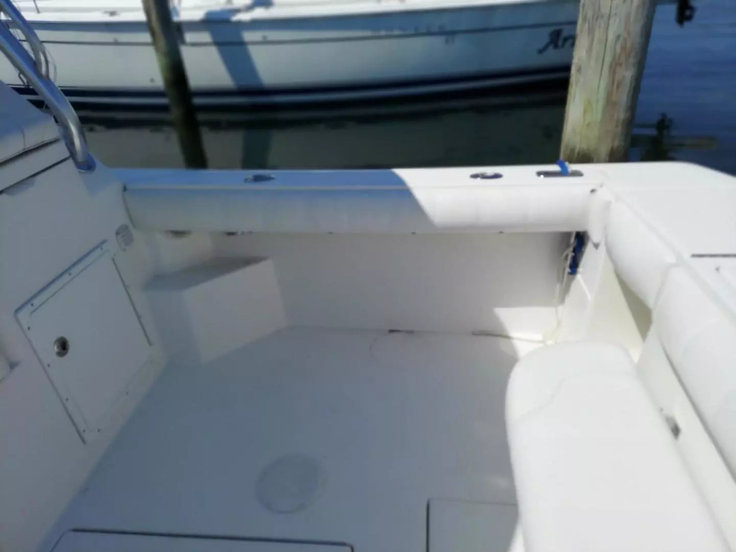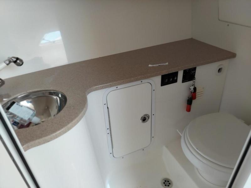 Convertible dinette and full width master bed is forward with a ventilation hatch and hanging locker. Aft to port is the spacious galley area and aft to starboard is the enclosed head with shower. Up a couple of steps to the helm deck with a center helm and an L-shaped settee seat to starboard. Companionway door is to port. Aft to the cockpit you have a mezzanine seat with a bait prep station to starboard followed by a stowable aft bench seat. A transom door leads to the swim platform.