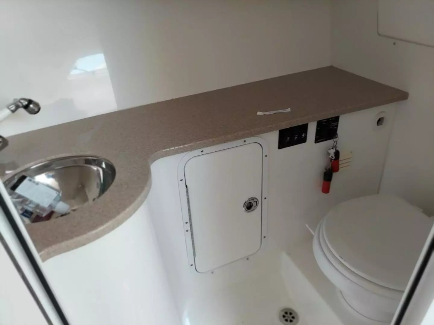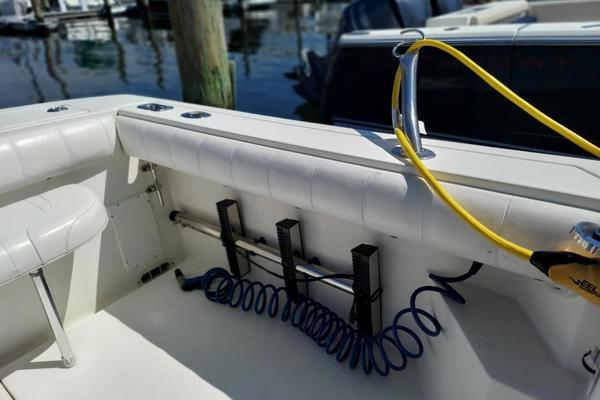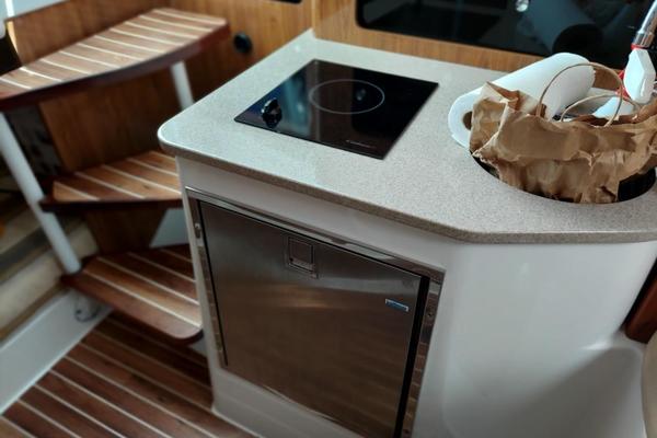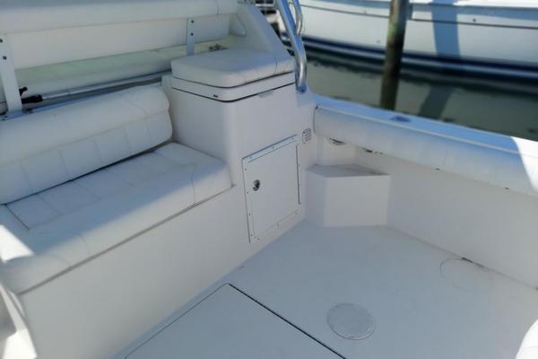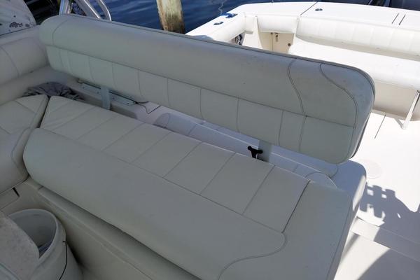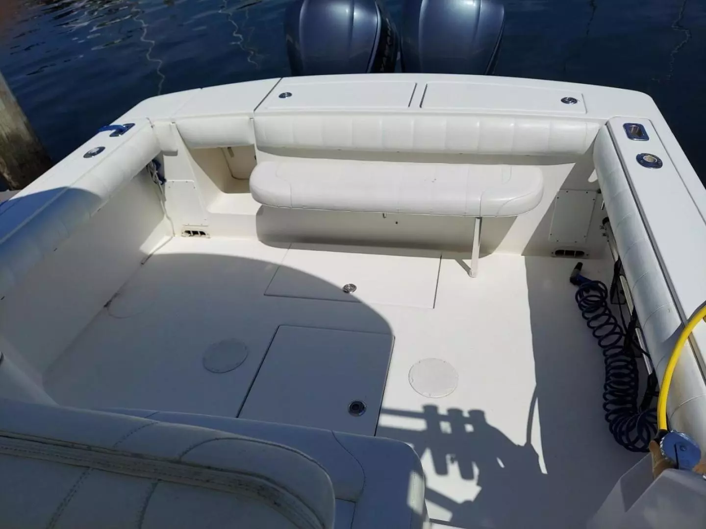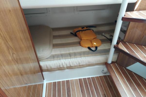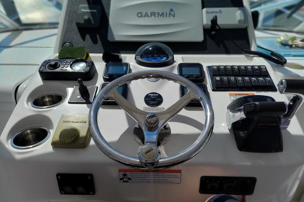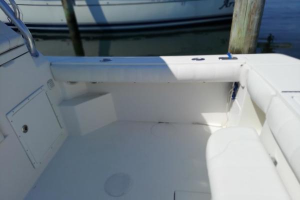 Convertible dinette and full width master bed is forward with a ventilation hatch and hanging locker. Aft to port is the spacious galley area and aft to starboard is the enclosed head with shower. Up a couple of steps to the helm deck with a center helm and an L-shaped settee seat to starboard. Companionway door is to port. Aft to the cockpit you have a mezzanine seat with a bait prep station to starboard followed by a stowable aft bench seat. A transom door leads to the swim platform.