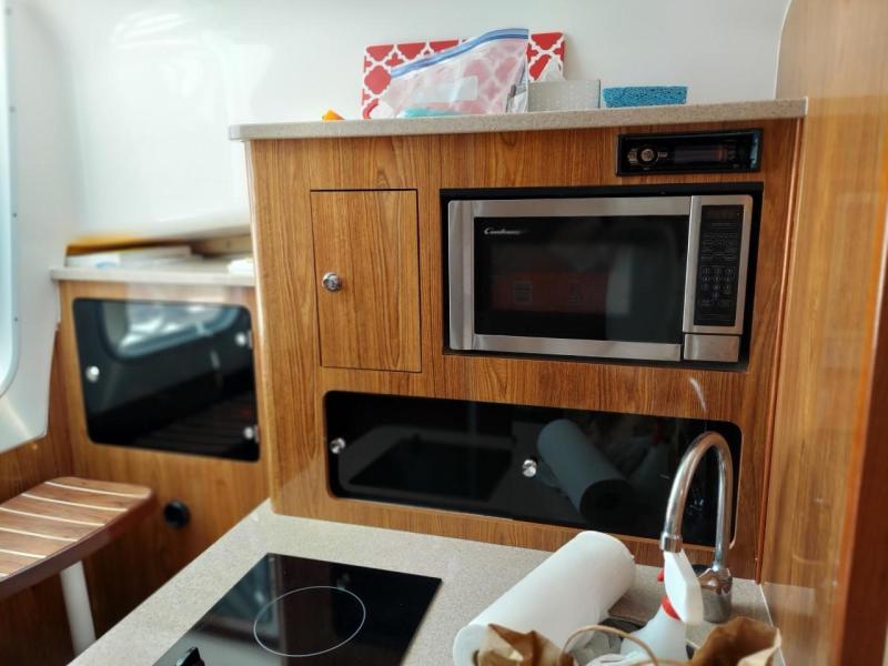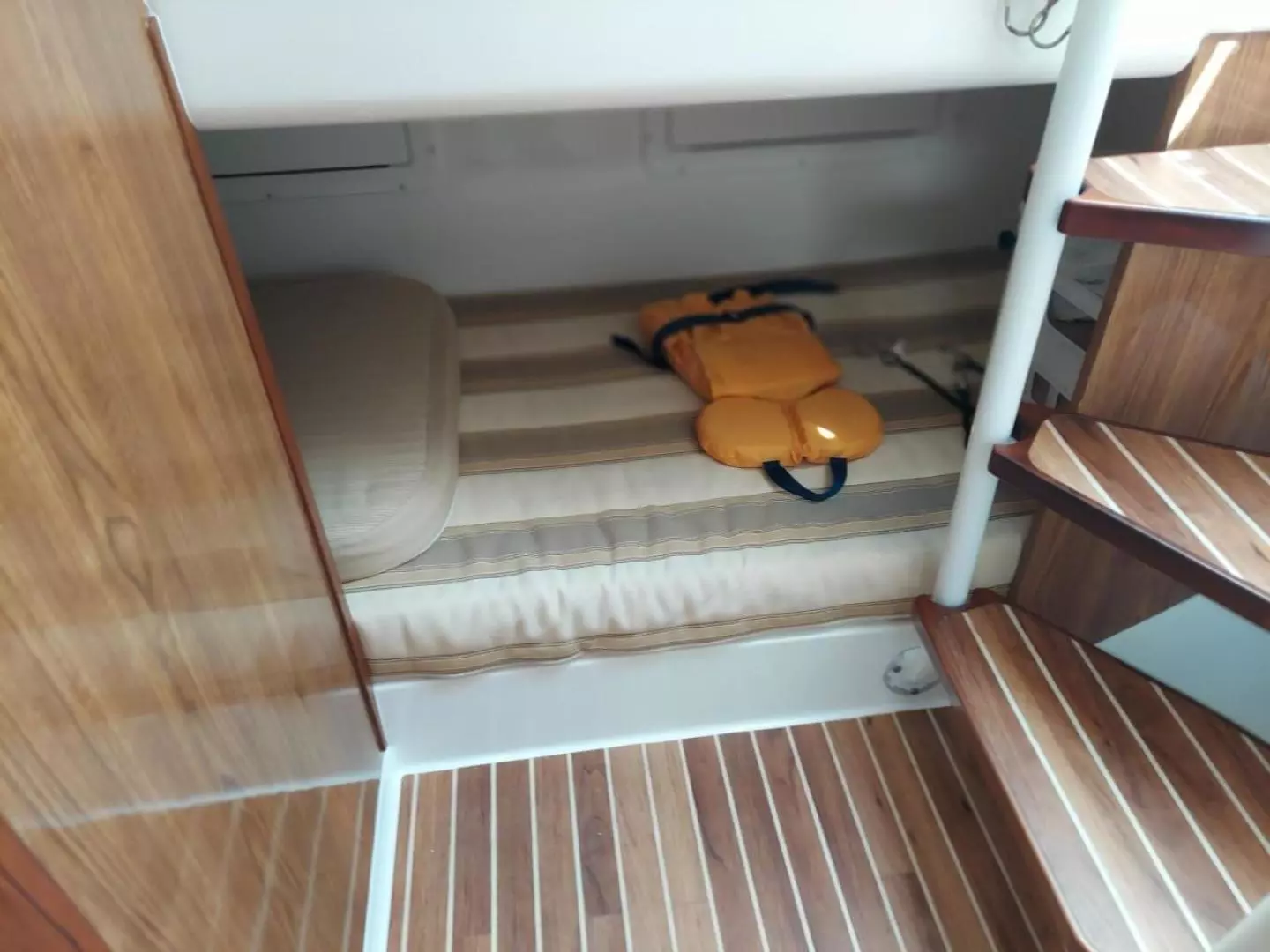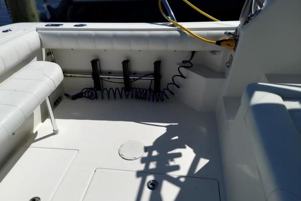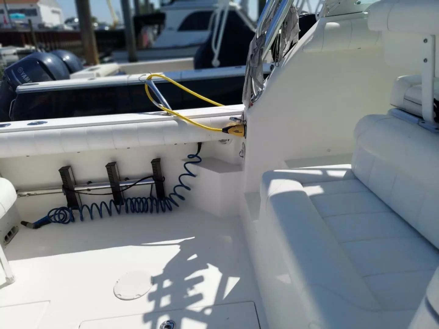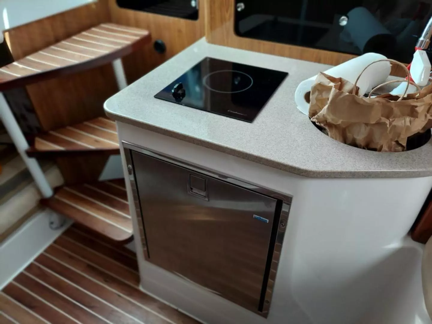 Convertible dinette and full width master bed is forward with a ventilation hatch and hanging locker. Aft to port is the spacious galley area and aft to starboard is the enclosed head with shower. Up a couple of steps to the helm deck with a center helm and an L-shaped settee seat to starboard. Companionway door is to port. Aft to the cockpit you have a mezzanine seat with a bait prep station to starboard followed by a stowable aft bench seat. A transom door leads to the swim platform.