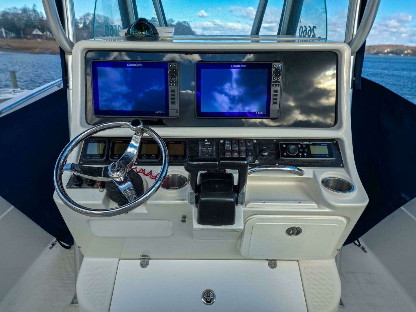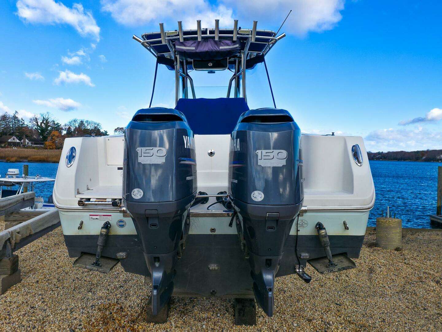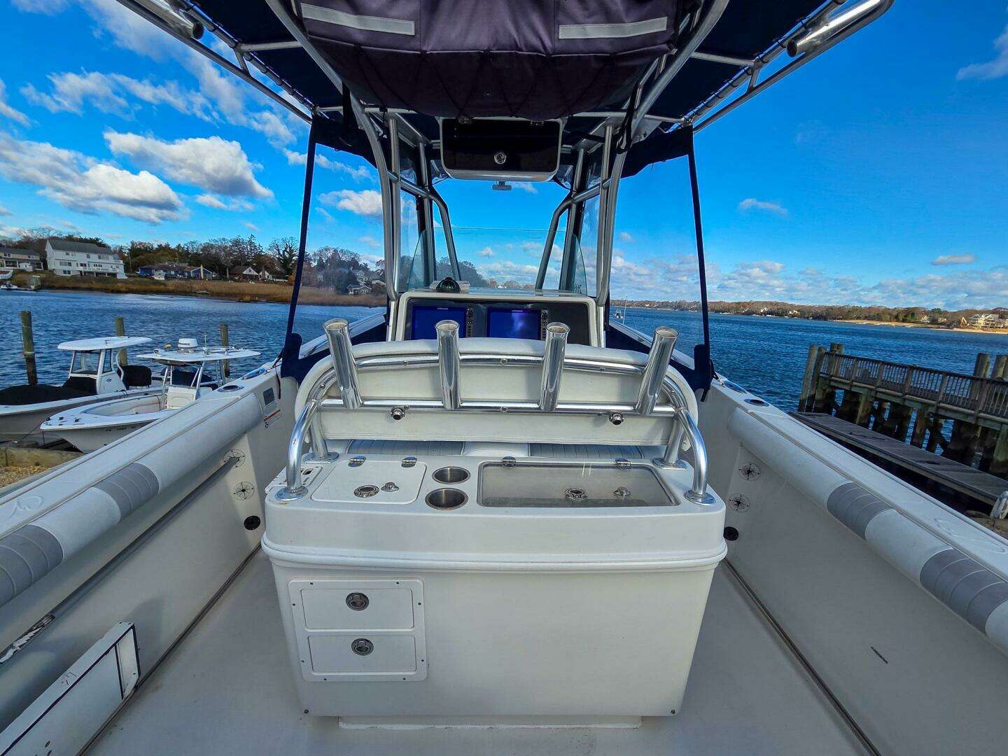 Boat shows very well and has been well cared for. New electronics upgrades and side curtains make this a joy to run in any condition. Outboards were winterized - lower units missing from pictures but are definitely included and no issues with them.
