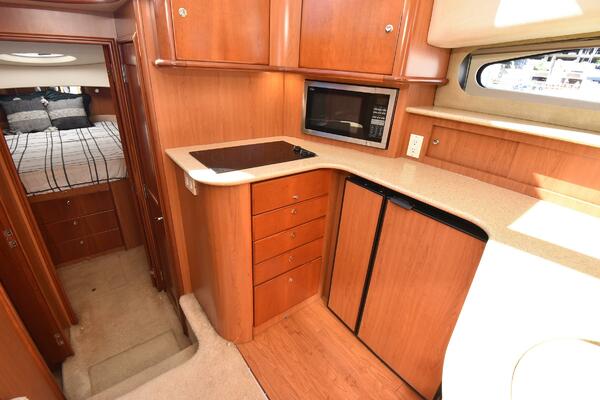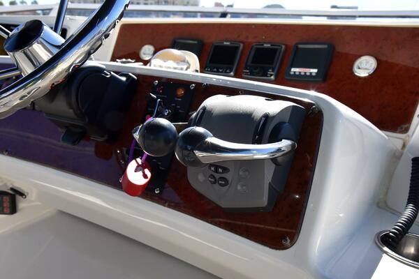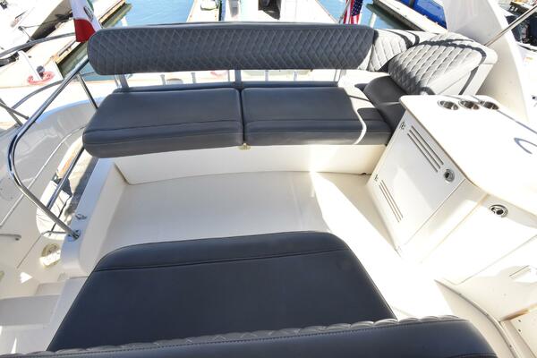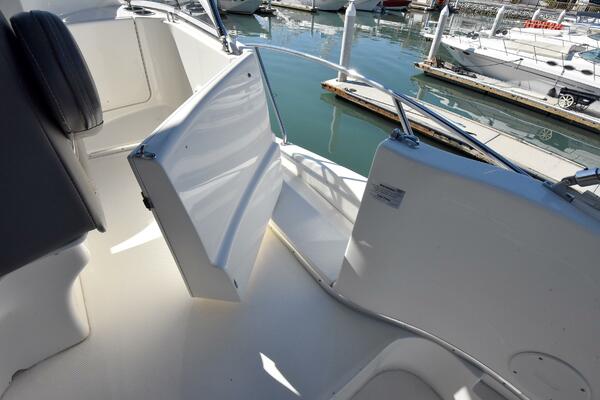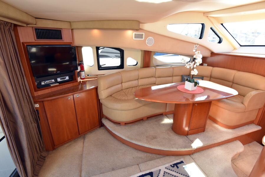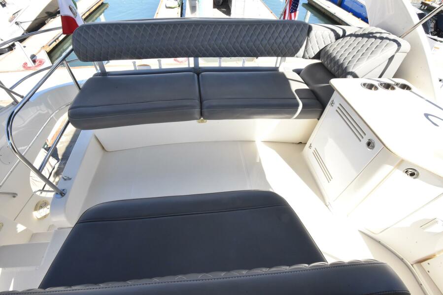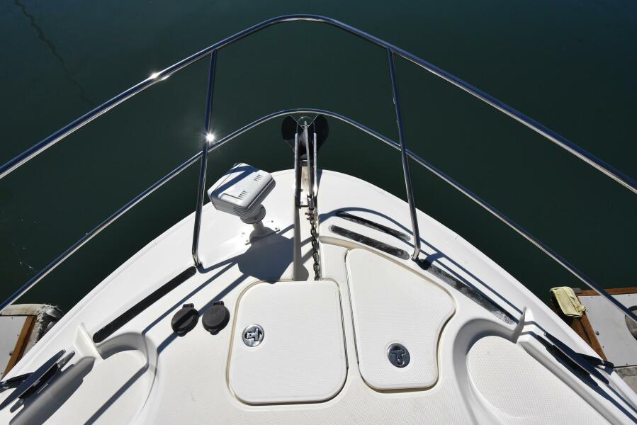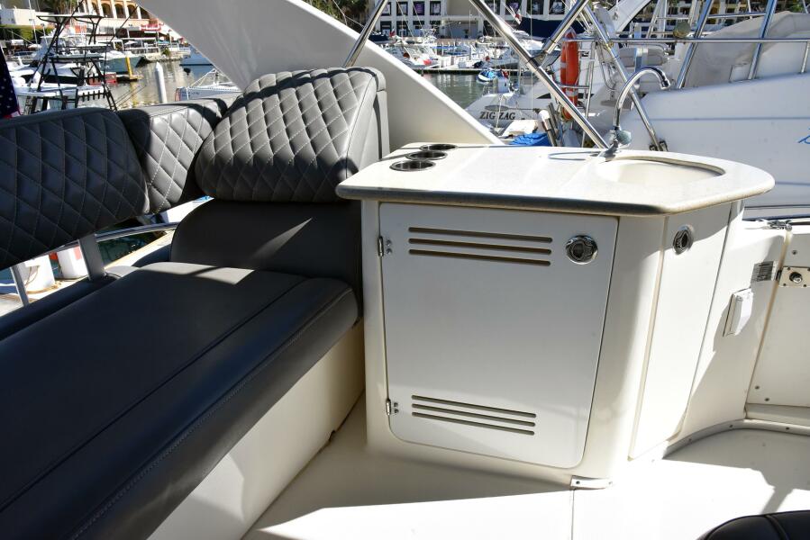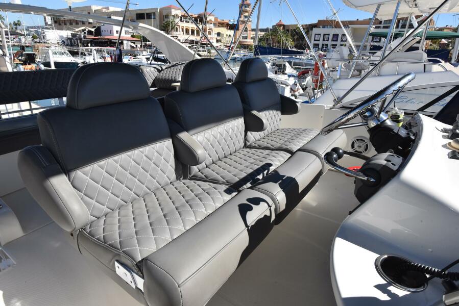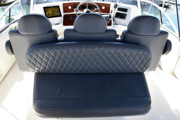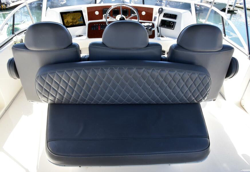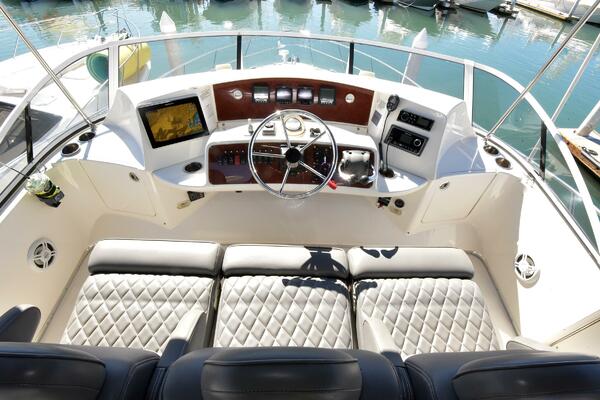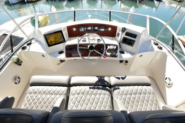 Powered for reliable cruising and equipped with a bow thruster, PURA VIDA makes docking and close-quarters maneuvering simple and stress-free. Her handling is smooth and responsive, providing a confident and comfortable ride. From the elevated bridge, you’ll enjoy excellent visibility and an open-air helm that enhances the overall cruising experience. Once up on plane, she runs quietly and efficiently, reflecting Silverton’s attention to hull design and engineering.