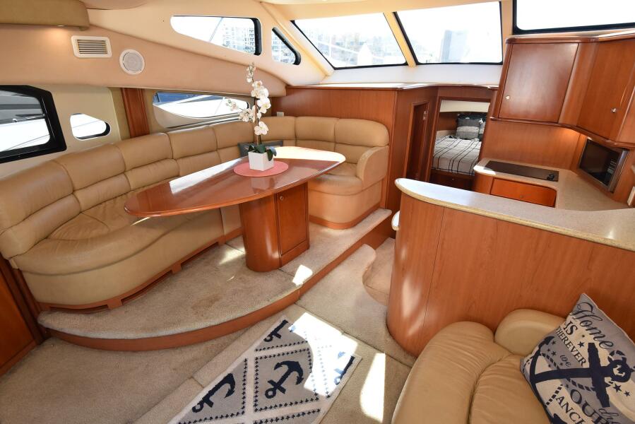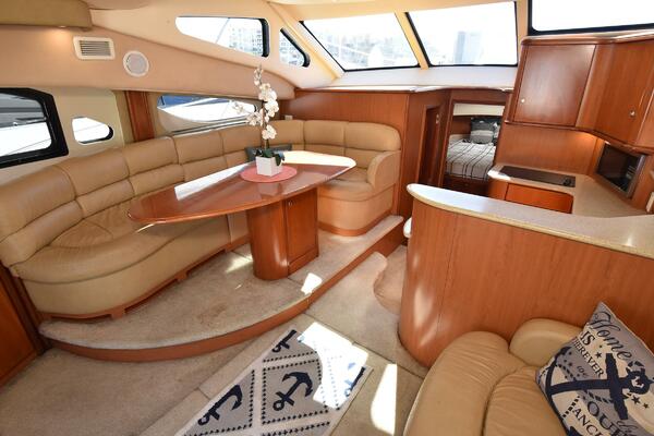 The interior layout is bright, open, and inviting—ideal for extended stays or weekend getaways. The salon features generous seating and large windows that flood the space with natural light. A fully equipped galley provides all the amenities of home, while the private staterooms offer comfort and relaxation after a day on the water.
