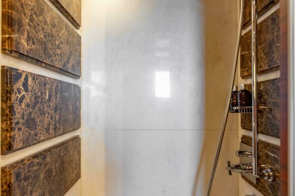 - Modern stainless steel and marble accents contrast the high gloss teak and lighter soft goods. throughout the interior --- not only in guest areas, but also in the galley and crew quarters where many other owners choose to cut costs.