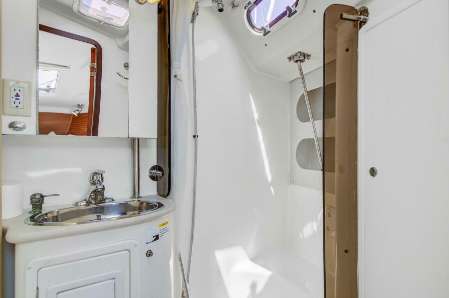 - Aft head with a vanity, sink, medicine chest, and shower.