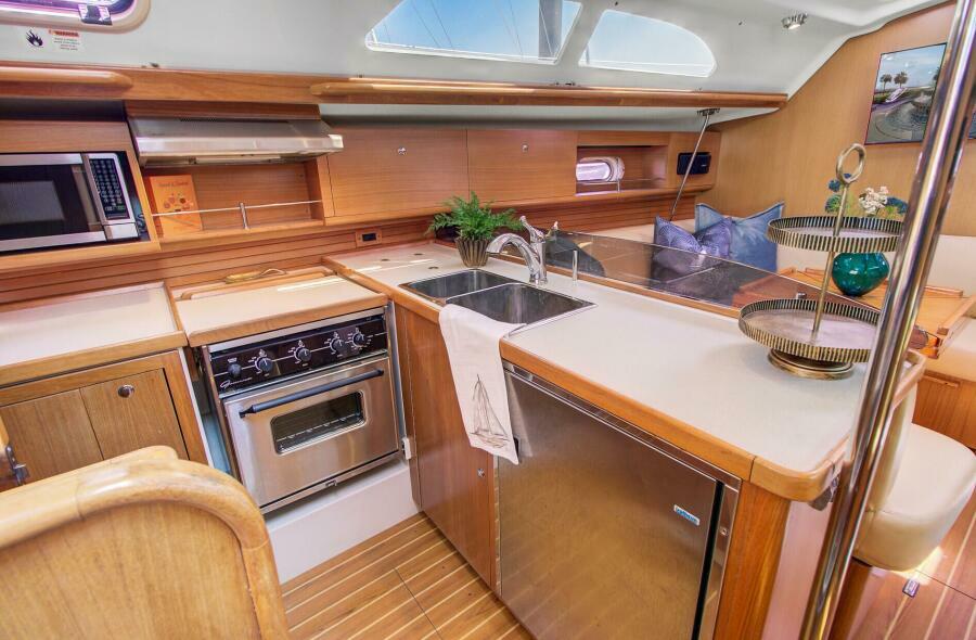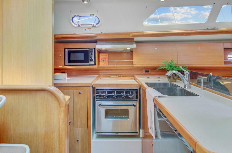 The Catalina 445 features a spacious interior with three cabins, two heads, a salon, and a galley. The owner's cabin is located forward and includes a centerline bed along with an en-suite head that has a separate shower. The salon has a U-shaped seating area with a table on the port side and additional seating on the starboard side. The galley is well-equipped for extended cruising and is positioned to port. A navigation station is situated on the starboard side. The starboard area includes a guest cabin with a double berth and access to the aft head. The port aft cabin is designed for versatility, easily convertible for use as extra sleeping quarters or utility space, providing flexibility for various cruising needs. The interior is finished in teak, creating a warm and inviting atmosphere.