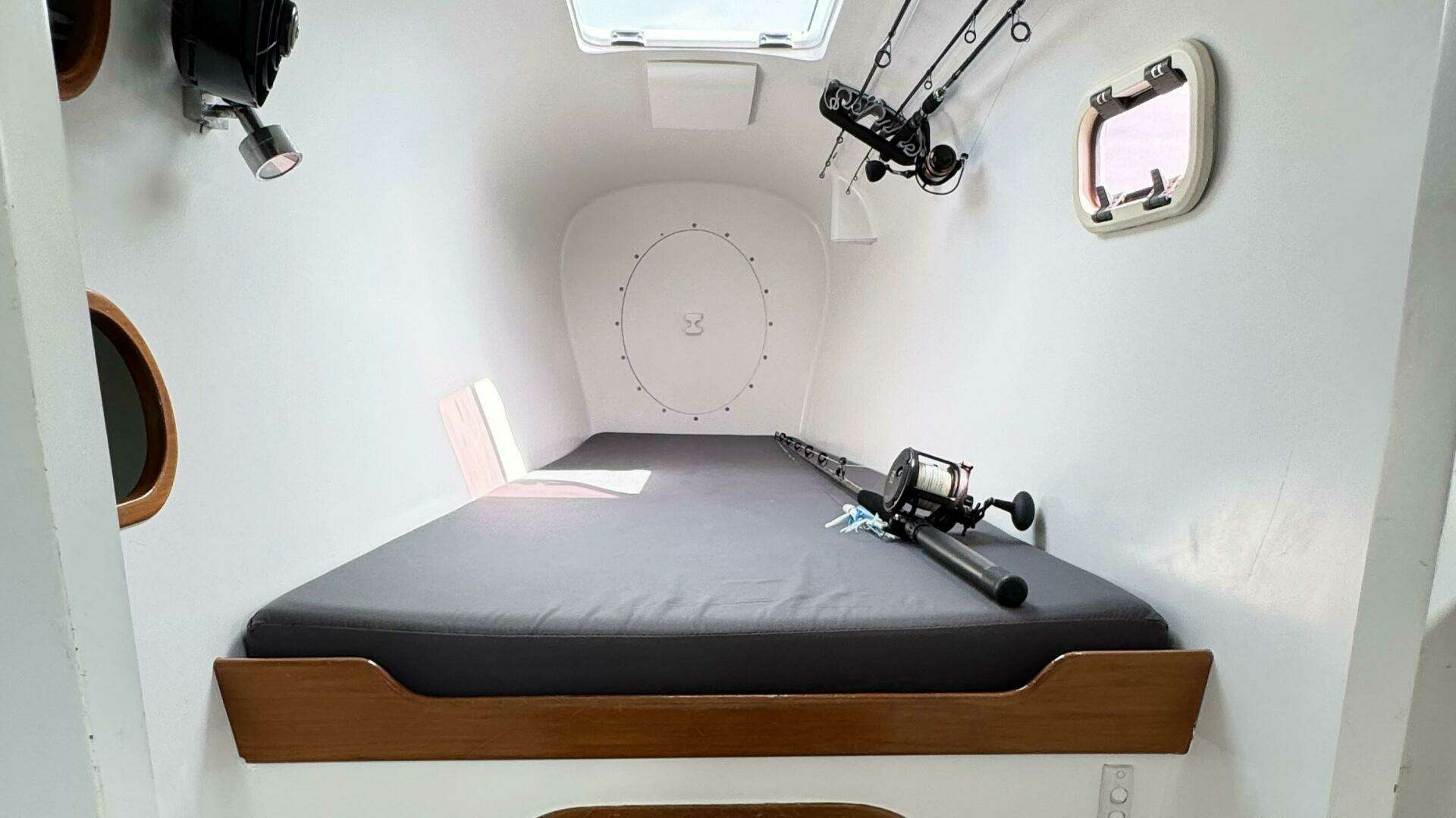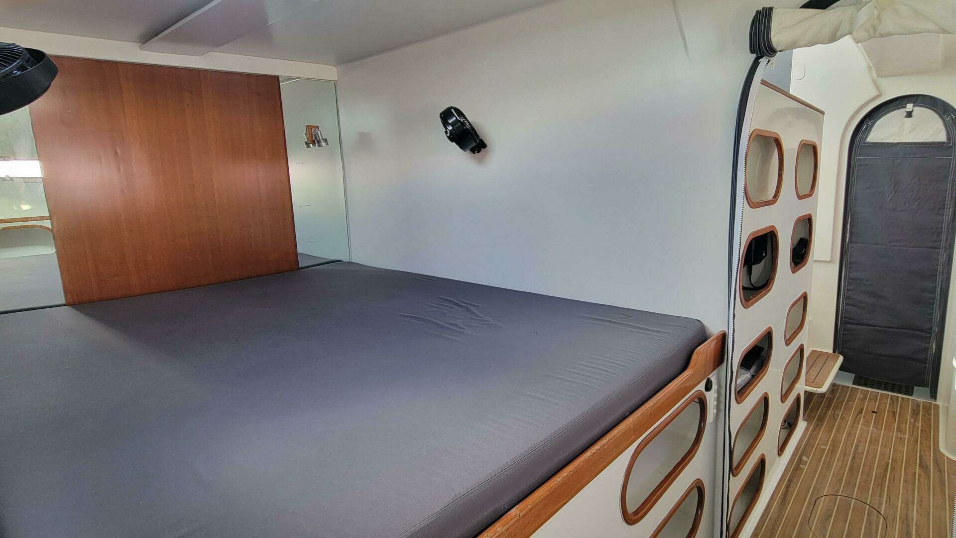 Each hull offers two double cabins forward, a single berth for storage or additional sleeping space, and a bathroom aft in both hulls, comfortably accommodating six guests, with the option to sleep two more in the saloon area.