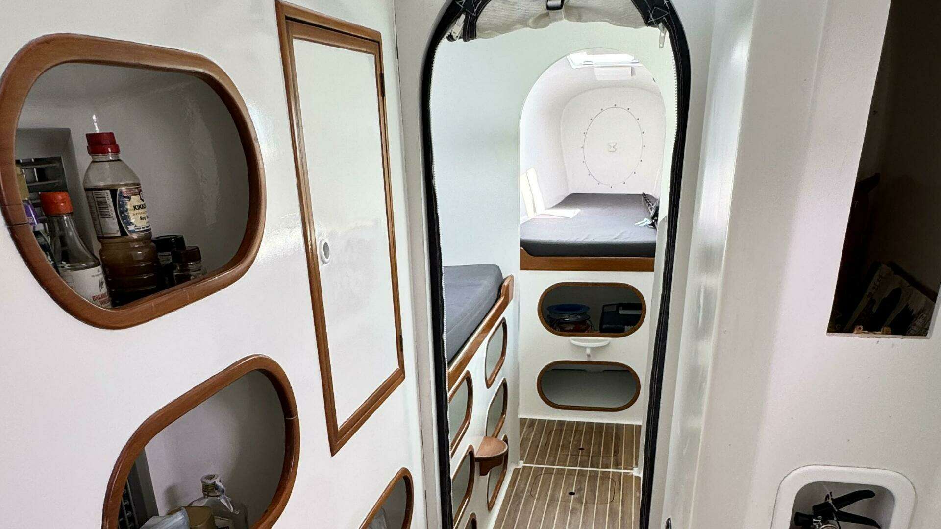 The twin new 20hp outboards lift out of the water while sailing, reducing drag and ensuring a smooth hull form with less risk of entanglement with floating debris. The accommodation is bright and breezy, with a saloon featuring a sliding canvas roof reminiscent of the classic MGB GT sports car, creating an open and airy atmosphere. Inside, the galley boasts an ingenious fridge and storage solution, complemented by a versatile table designed for both indoor and outdoor use.
