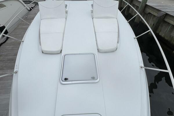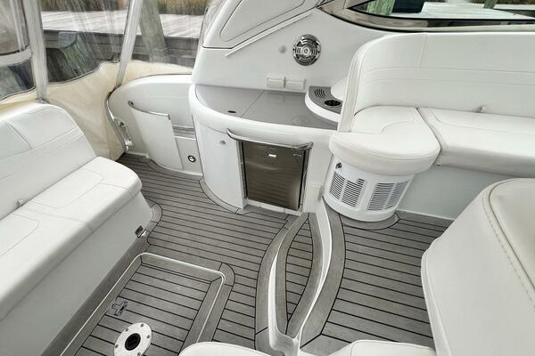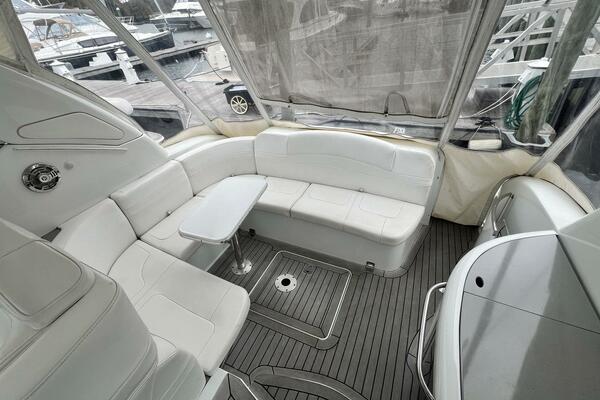 - Aft U-Shaped lounge seating with fiberglass-lined storage, two dual-height tables and sunpad inserts