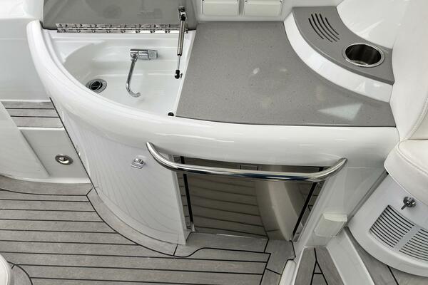- Molded wet bar with integrated sink, Corian® countertop, trash container, 316L stainless steel safety rail and 120V GFCI outlet