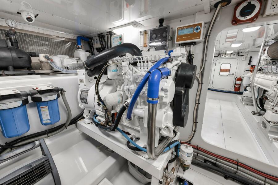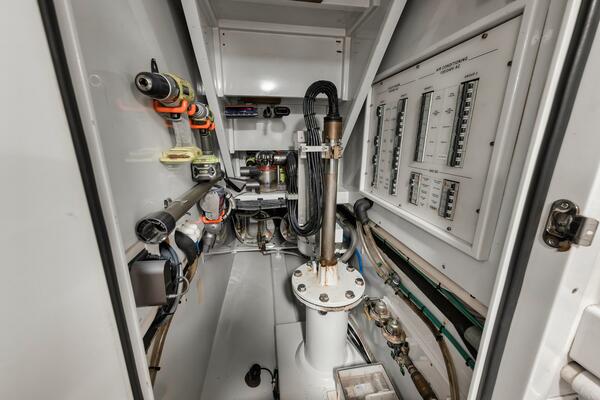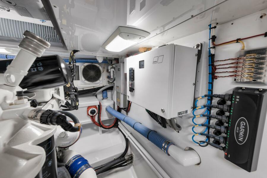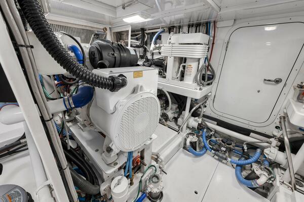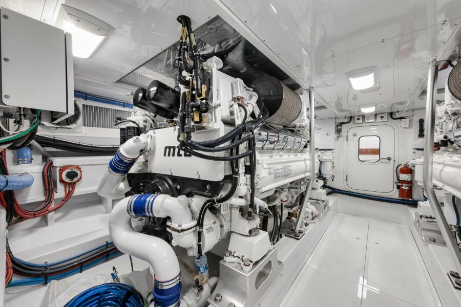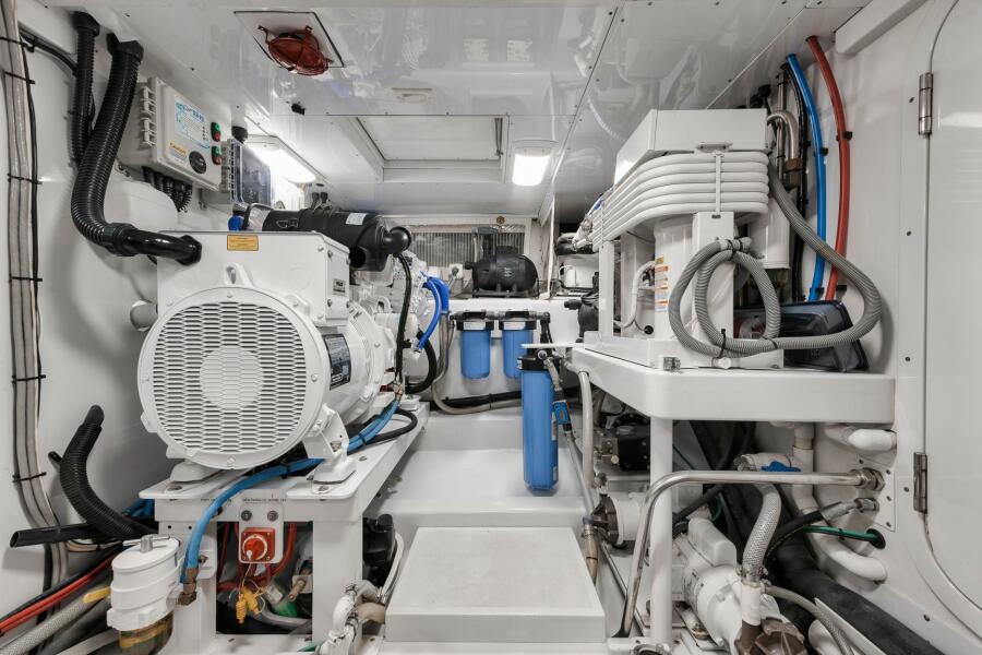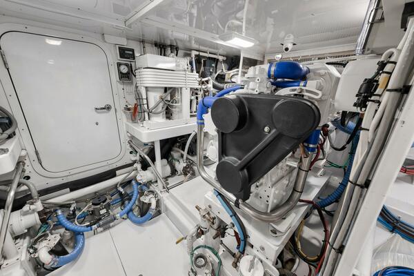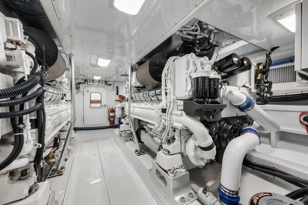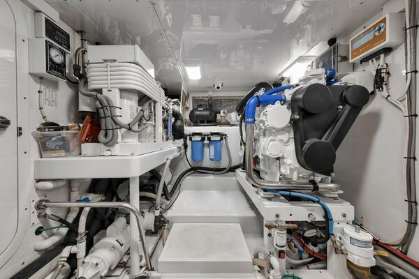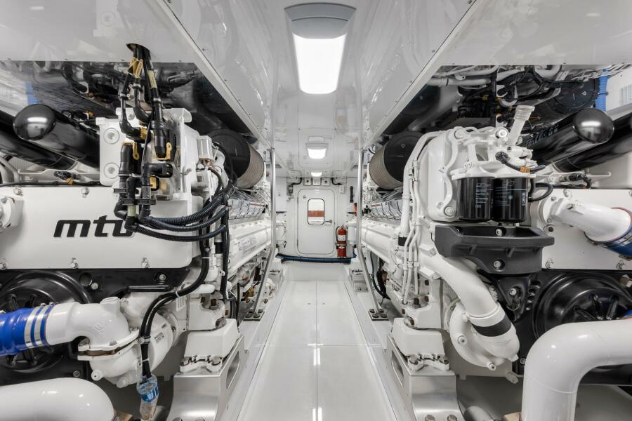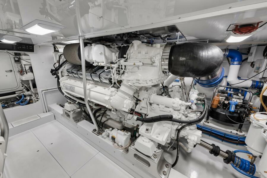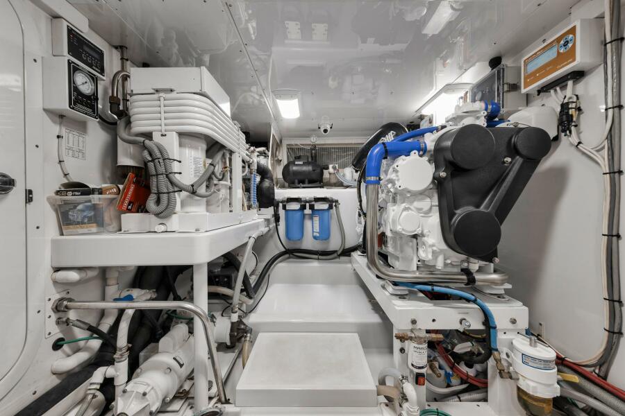 The engine room of the 71’ Jim Smith is a testament to the builder’s commitment to performance, accessibility, and meticulous craftsmanship. Immaculately finished with high-gloss white surfaces and excellent lighting, the space is both visually impressive and highly functional—designed with ease of maintenance and reliability in mind.