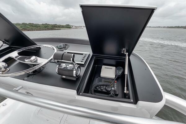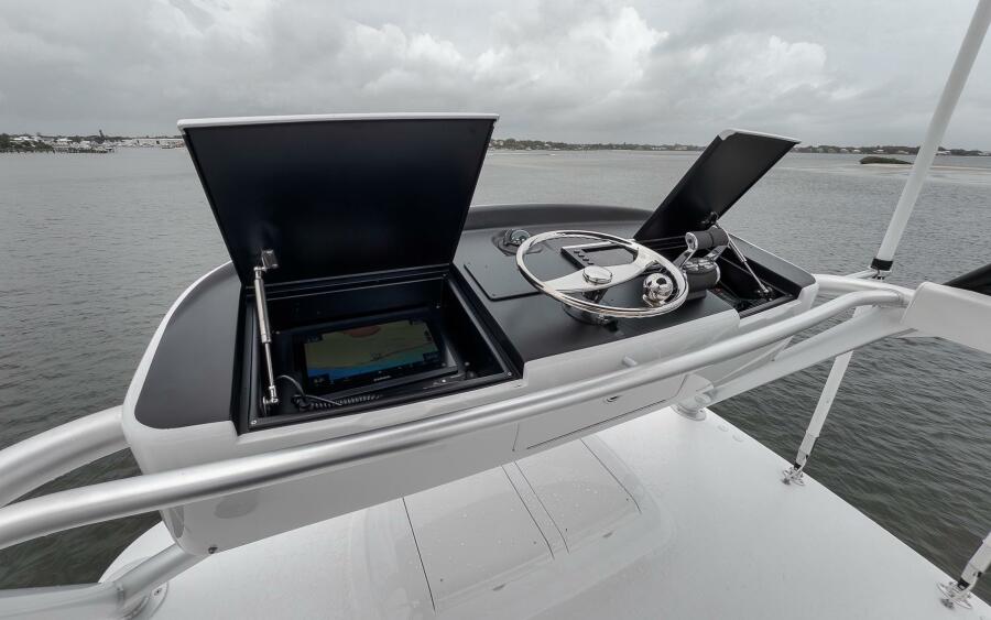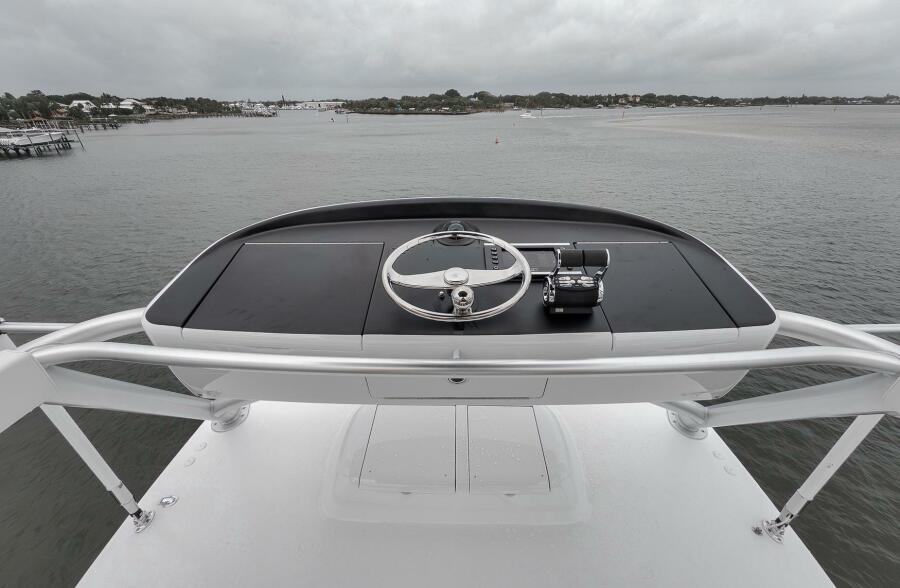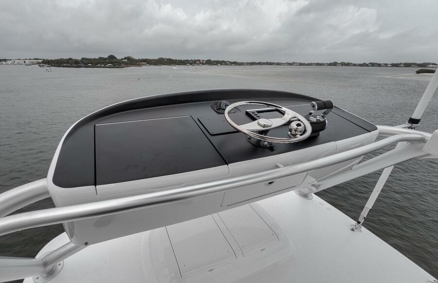 Seamlessly integrated into the tower and flybridge layout, the hardtop offers essential protection from the elements while maintaining the yacht’s streamlined, sporty profile.