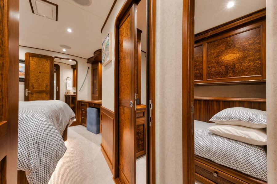 The guest accommodations below deck are spacious, comfortable, and thoughtfully designed to ensure every guest enjoys a luxurious stay on board. Rich satin-finished teak cabinetry with elegant Japanese burl wood inlays flows consistently throughout all staterooms, adding warmth and sophistication.