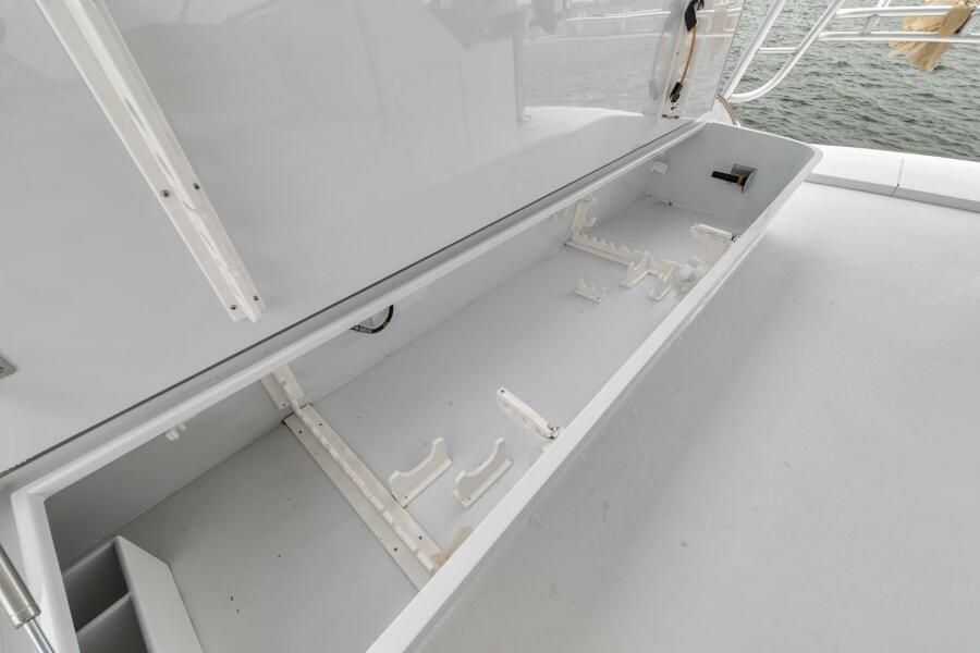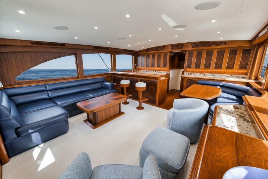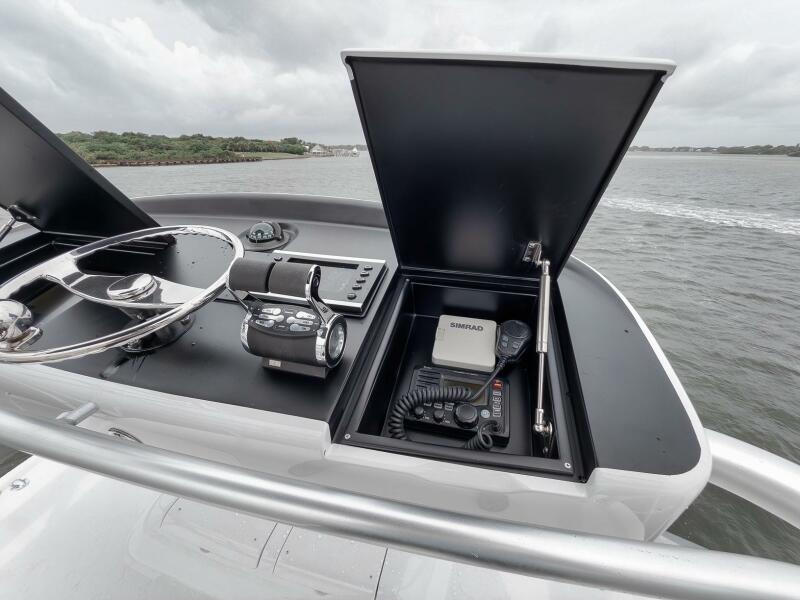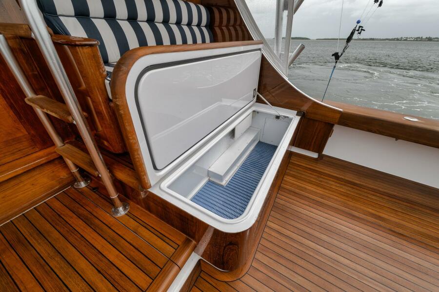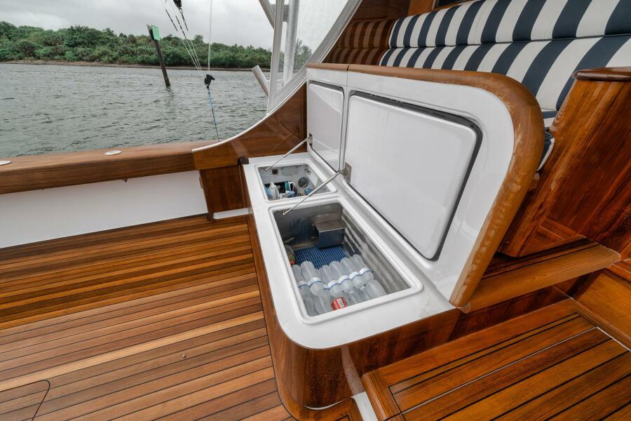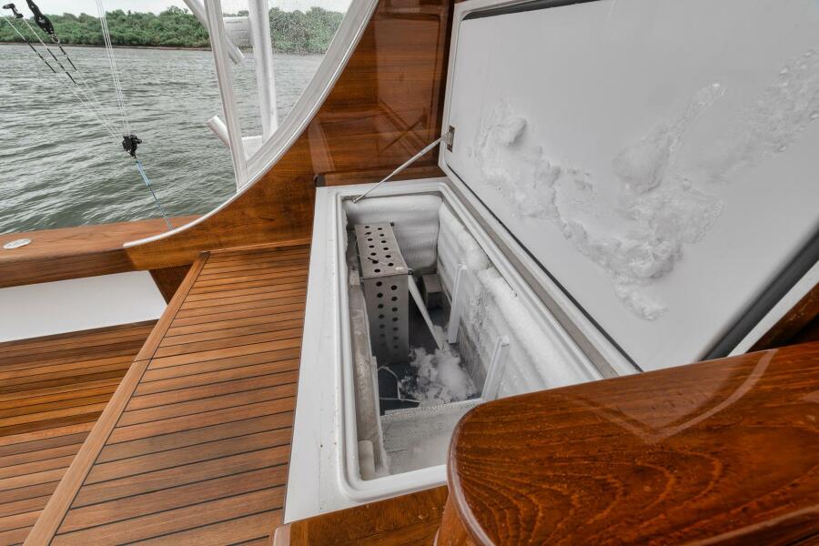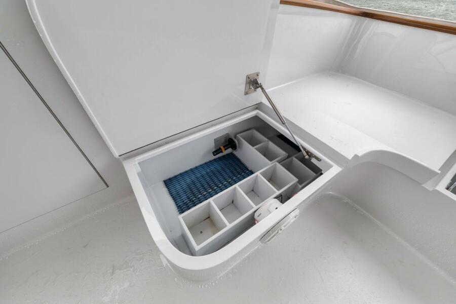 The mezzanine is a standout feature, combining luxury and functionality to enhance both the fishing experience and guest comfort. Positioned just above the cockpit, it provides an excellent vantage point for watching the spread or relaxing in the shade while underway. Cushioned seating with plush upholstery invites guests to lounge in comfort, and the space is thoughtfully designed with over head AC, drink boxes, and tackle drawers within easy reach—keeping everything organized and accessible without ever stepping foot into the salon.