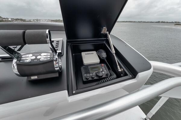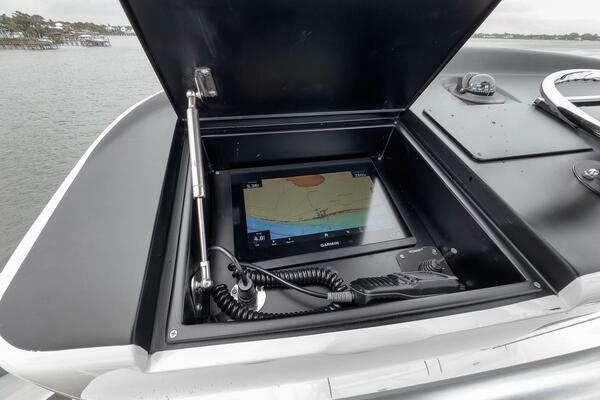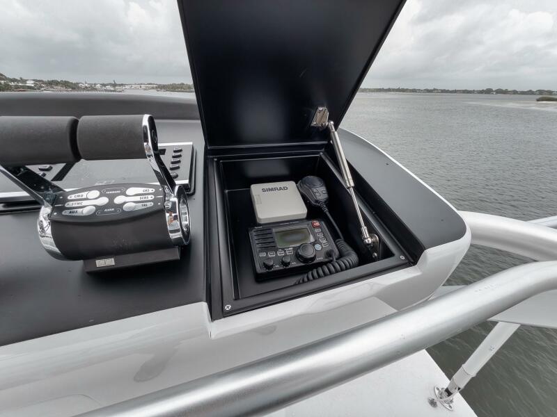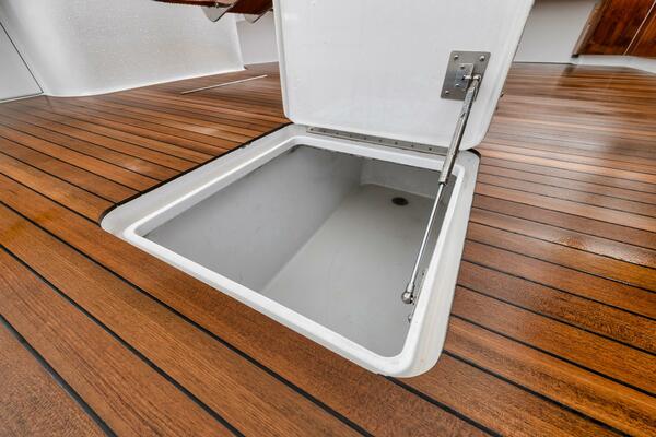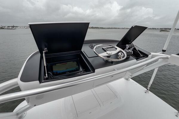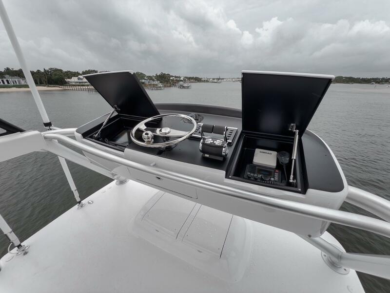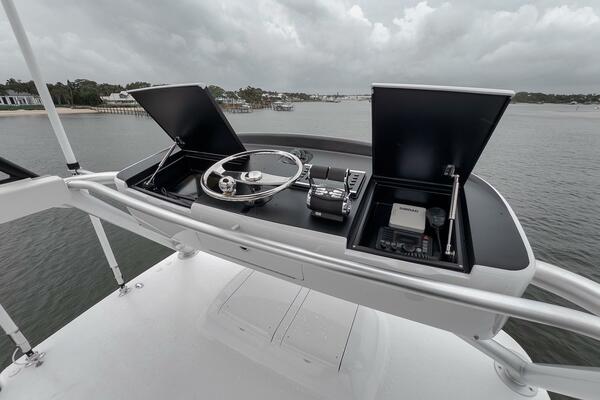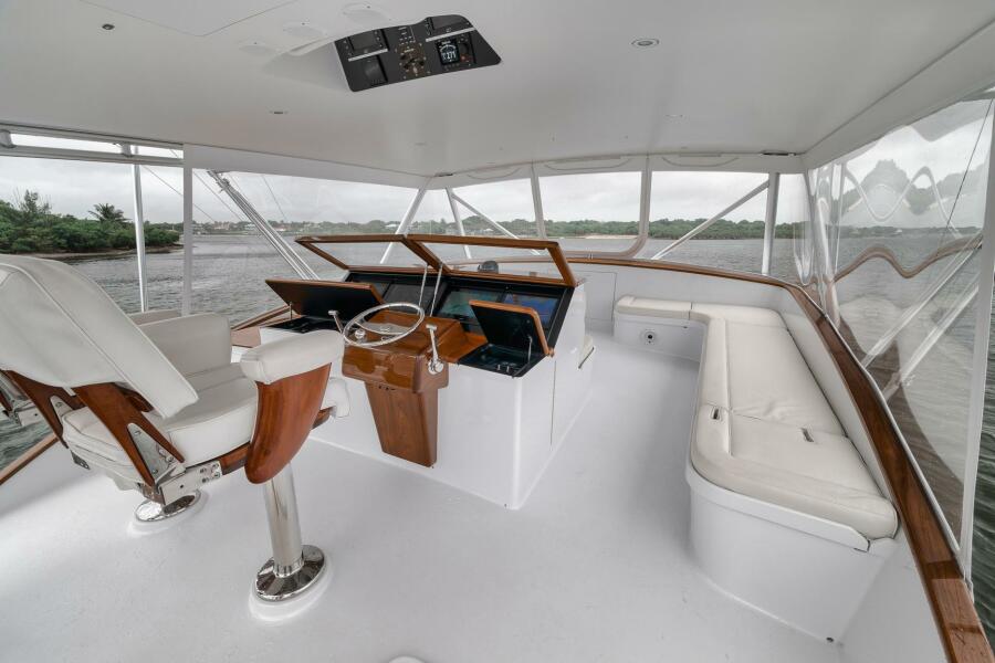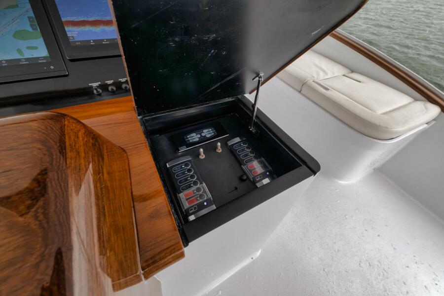 The mezzanine is a standout feature, combining luxury and functionality to enhance both the fishing experience and guest comfort. Positioned just above the cockpit, it provides an excellent vantage point for watching the spread or relaxing in the shade while underway. Cushioned seating with plush upholstery invites guests to lounge in comfort, and the space is thoughtfully designed with over head AC, drink boxes, and tackle drawers within easy reach—keeping everything organized and accessible without ever stepping foot into the salon.