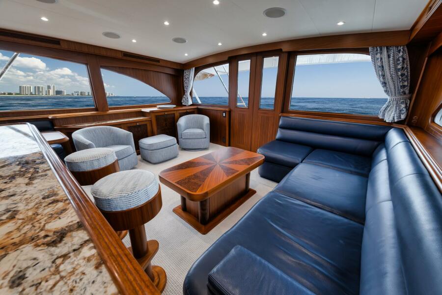As you enter the salon you will immediately recognize the sophistication of craftsmanship and attention to detail that sets this boat apart from others. The salon on board is very spacious and comfortably laid out. There is an L-shaped sofa to port, with a custom teak hi/lo table that is great for dining. A well equipped entertainment center with a 55’ pop up TV will keep all on board entertained. Two comfortable custom teak bar stools complement the countertop that also doubles as a bar. The dinette is very roomy with a gorgeous teak table that is great for enjoying a meal or even a workspace.