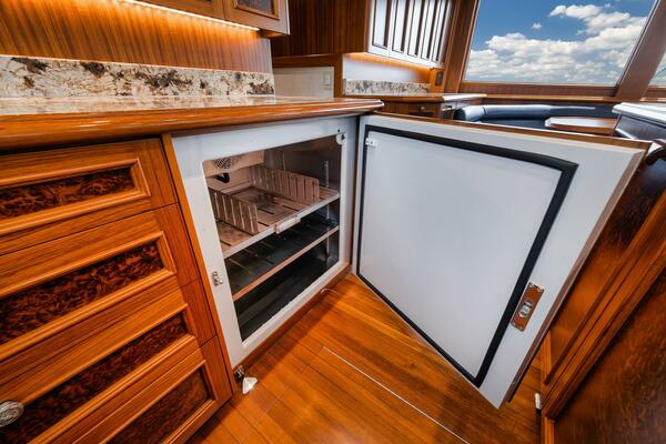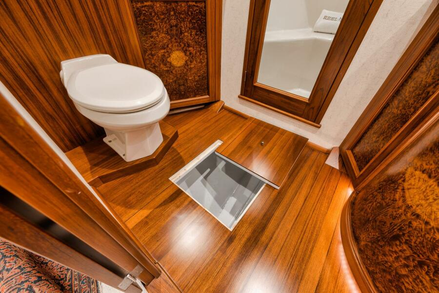 The onboard galley is exceptionally well-equipped with premium appliances, including two large refrigerator/freezers, a four-burner cooktop, dishwasher, microwave convection oven, oversized sink with disposal, ice machine, and an additional large freezer for extended frozen food storage. Expansive marble countertops provide ample workspace, ideal for meal preparation. Storage is plentiful, featuring an oversized pantry perfect for stocking up on provisions for long voyages. The elegant cabinetry is complemented by rich, satin-finished teak hardwood floors, creating a warm and refined atmosphere throughout the galley.
