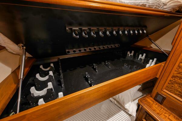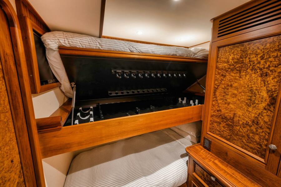 To starboard, the guest stateroom offers generously sized over-under bunks and a private en suite head. The VIP stateroom features versatile side-by-side berths that can slide together to form a queen, along with a convenient Pullman berth for additional guests. It also boasts a large private head with a roomy walk-in shower.