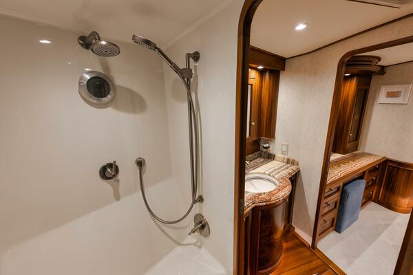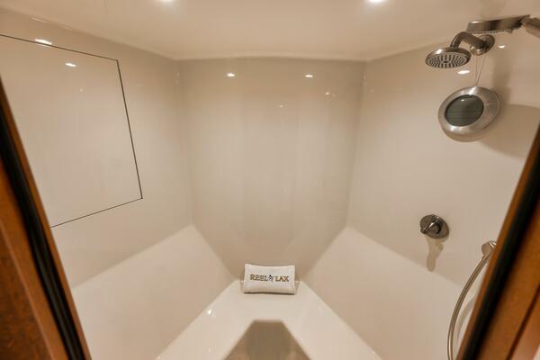 Forward, there’s a single-berth stateroom equipped with a Pullman and built-in rod storage—ideal for longer stays or gear-heavy trips. Furthest forward lies the expansive and luxurious master stateroom, complete with a full queen berth, abundant hanging locker space, and a marble-topped vanity that doubles as a workspace. The en suite master head is equally refined, featuring a spacious walk-in shower and upscale finishes throughout.