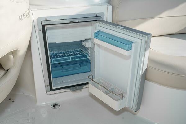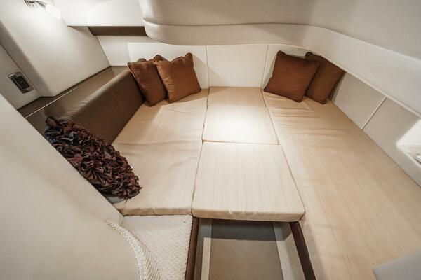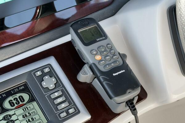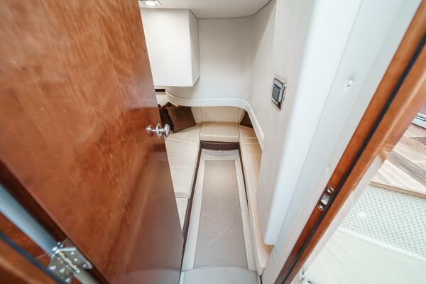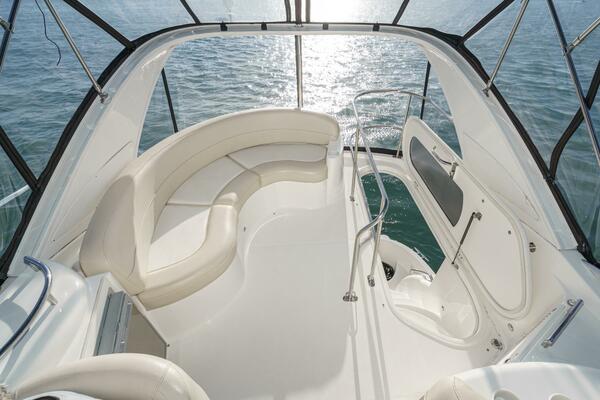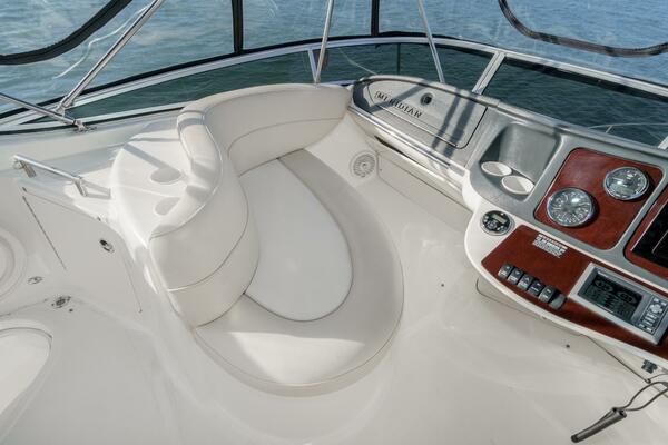 The flybridge is one of the Meridian 341’s standout features — easily accessed via molded stairs from the cockpit. The helm provides excellent visibility and is equipped with Raymarine navigation electronics, thruster controls, and comfortable captain chair and companion seating. A large wraparound lounge and wet bar make it an ideal spot for entertaining underway or at anchor.