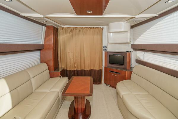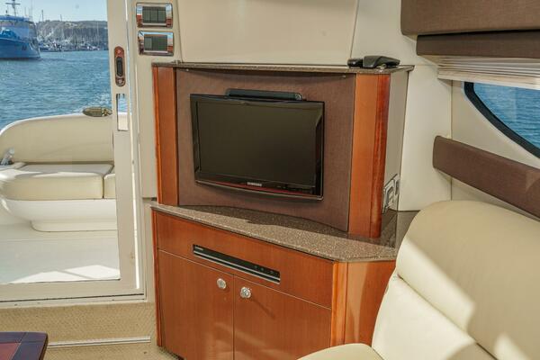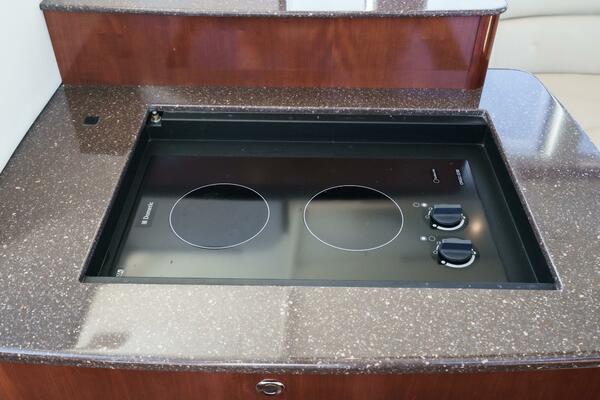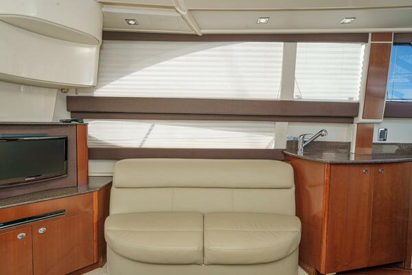 The open-concept salon offers abundant natural light with wraparound windows and sliding glass doors. To starboard, the Ultraleather lounge creates a warm and inviting living area. The galley features a refrigerator/freezer, cooktop, microwave, stainless sink, and ample storage — perfect for weekend cruising or entertaining.