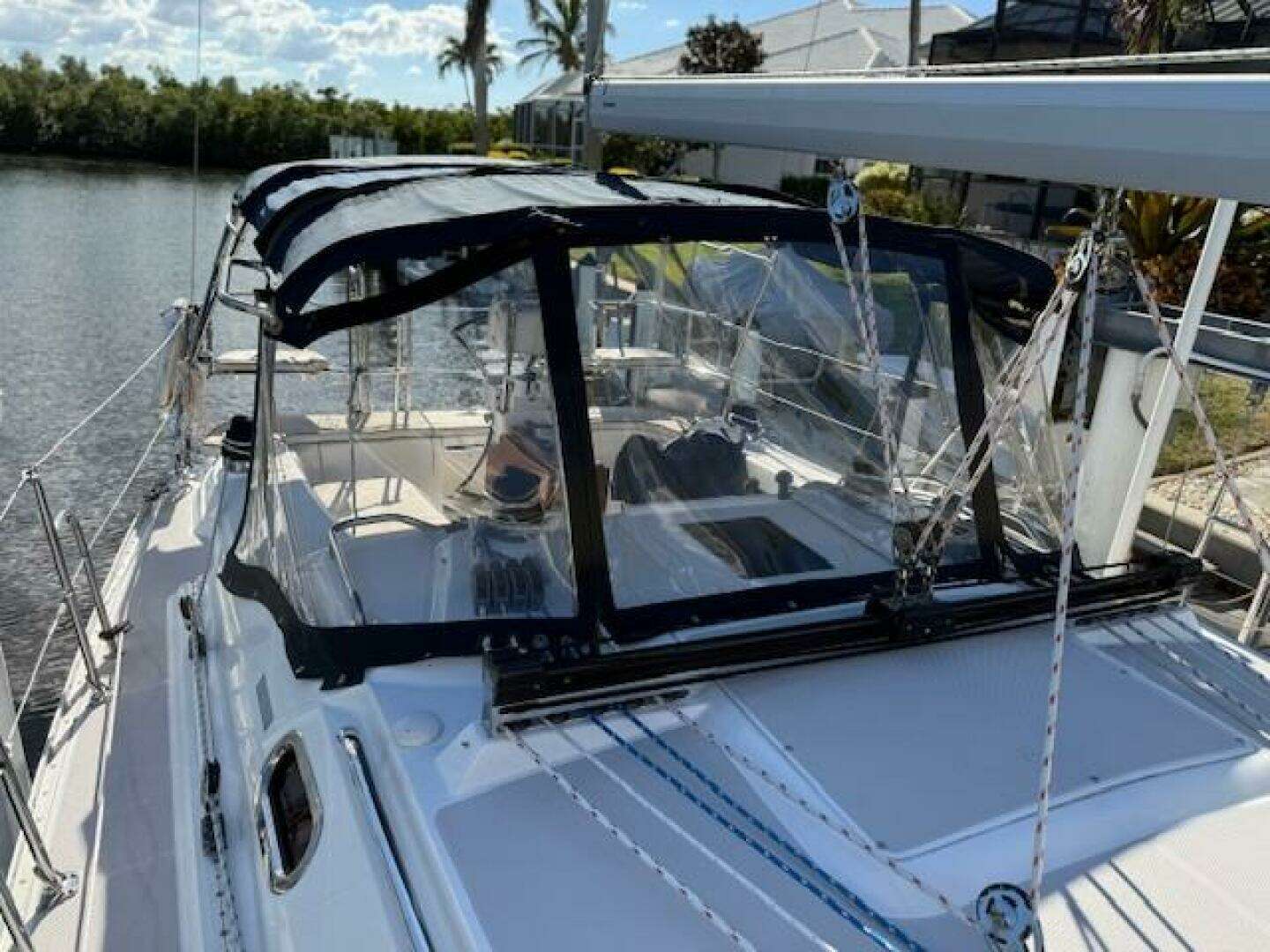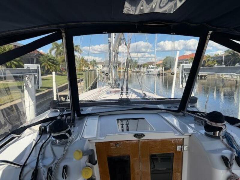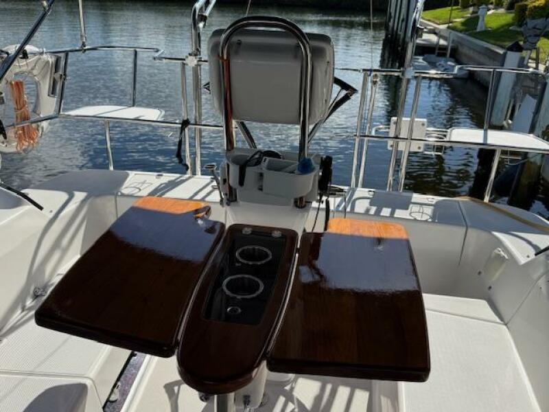 Covers: Cockpit table, winches; Canvas cover for traveler, matching Bimini top; Custom Sunbrella cover for cockpit table with drink holder cutouts. This protects the table but allows drinks to be secured while under sail. Custom heavy-duty covers for cabin top and foredeck