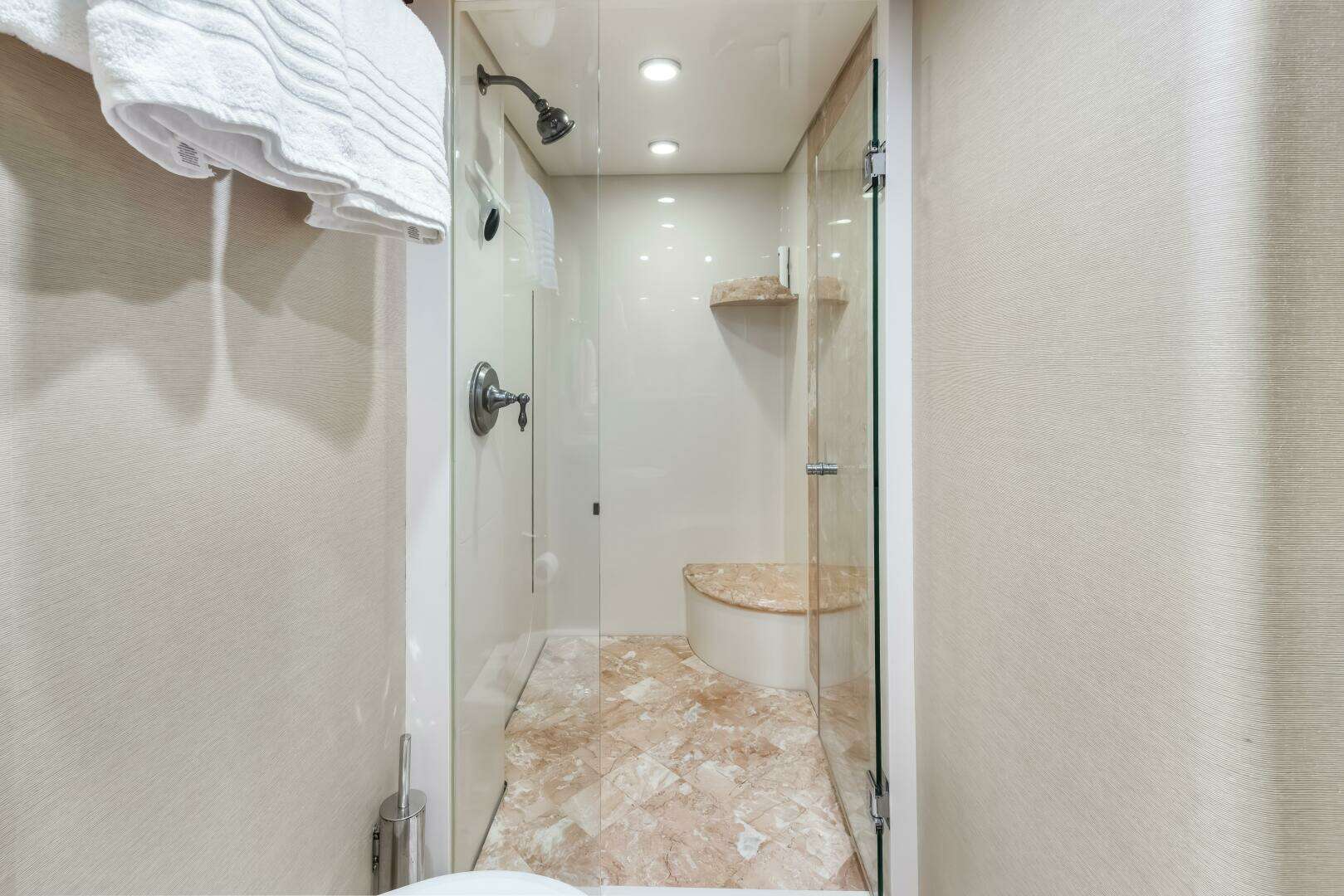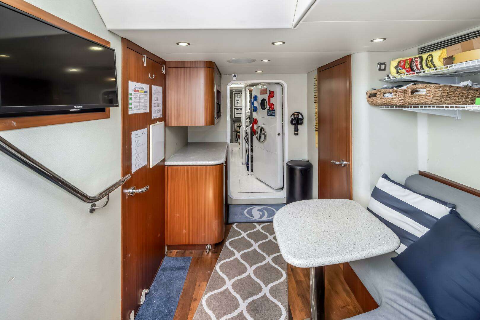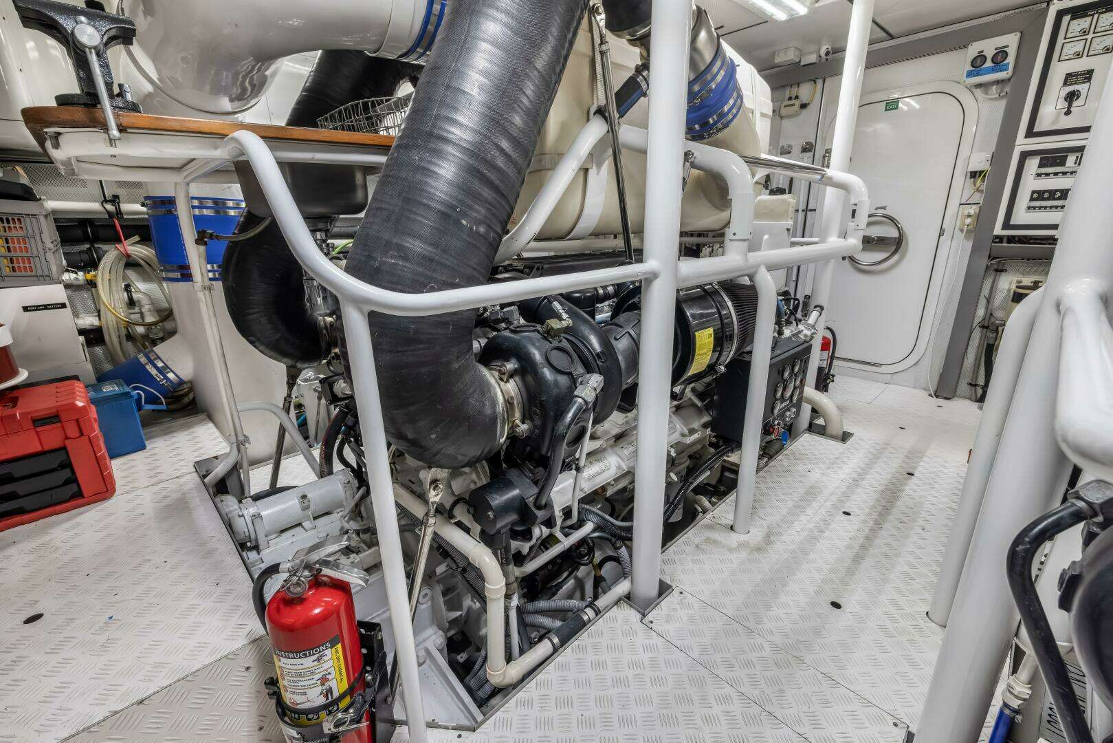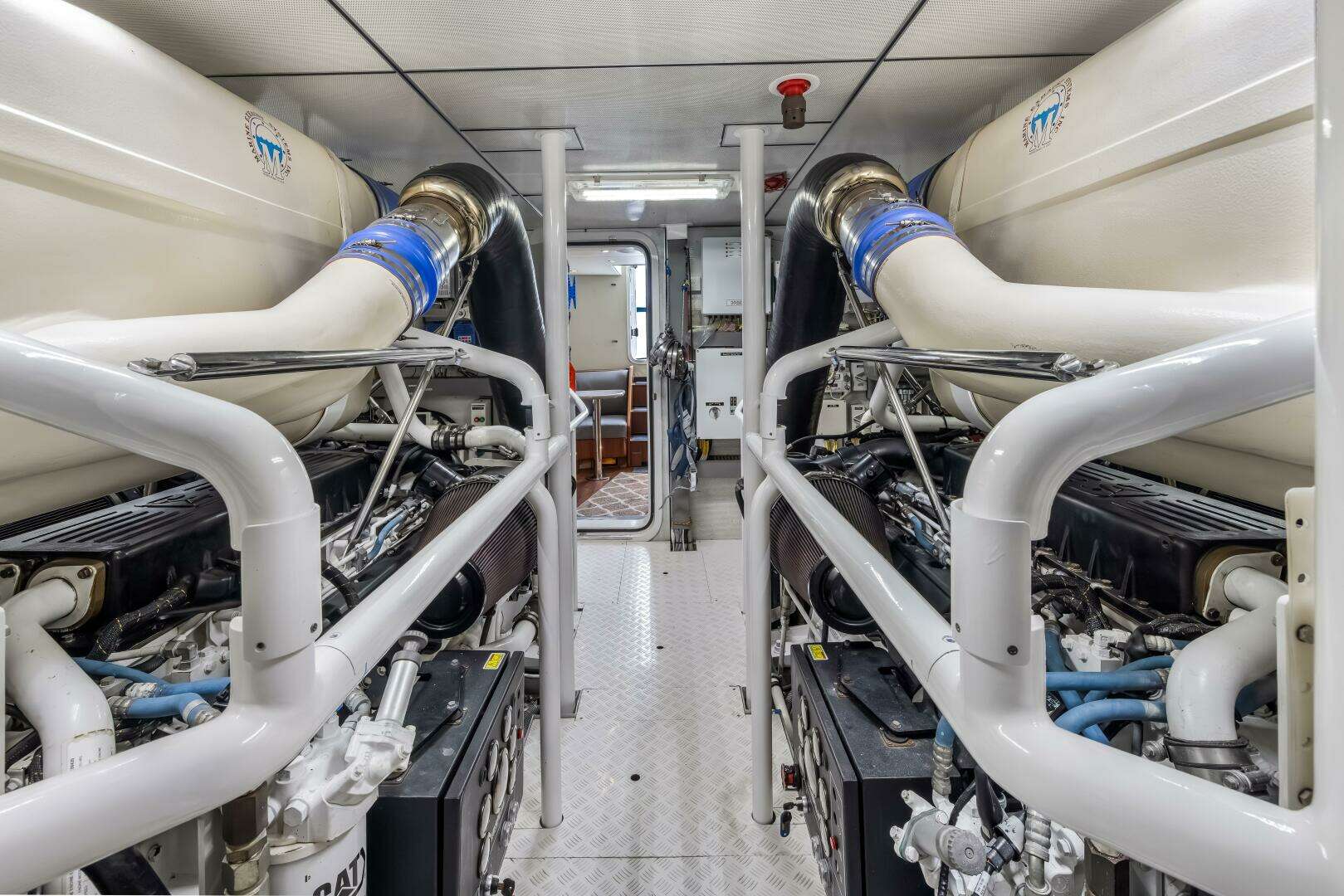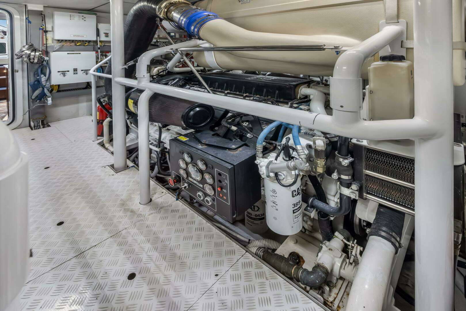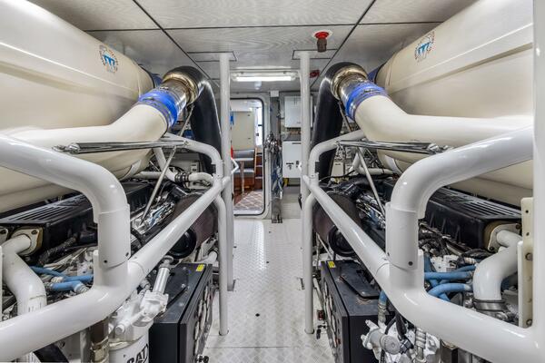 The crew quarters and engine room are accessed via a center-line transom door in the cockpit. From there, you first enter the crew area with one stateroom to port (2 berths) and another to stbd (full berth). Further forward is the engine room maintained to A-1 yacht quality standards and featuring twin Caterpillar C-32 Acert engines, twin 32kw Kohler generators and many more "big yacht" options.