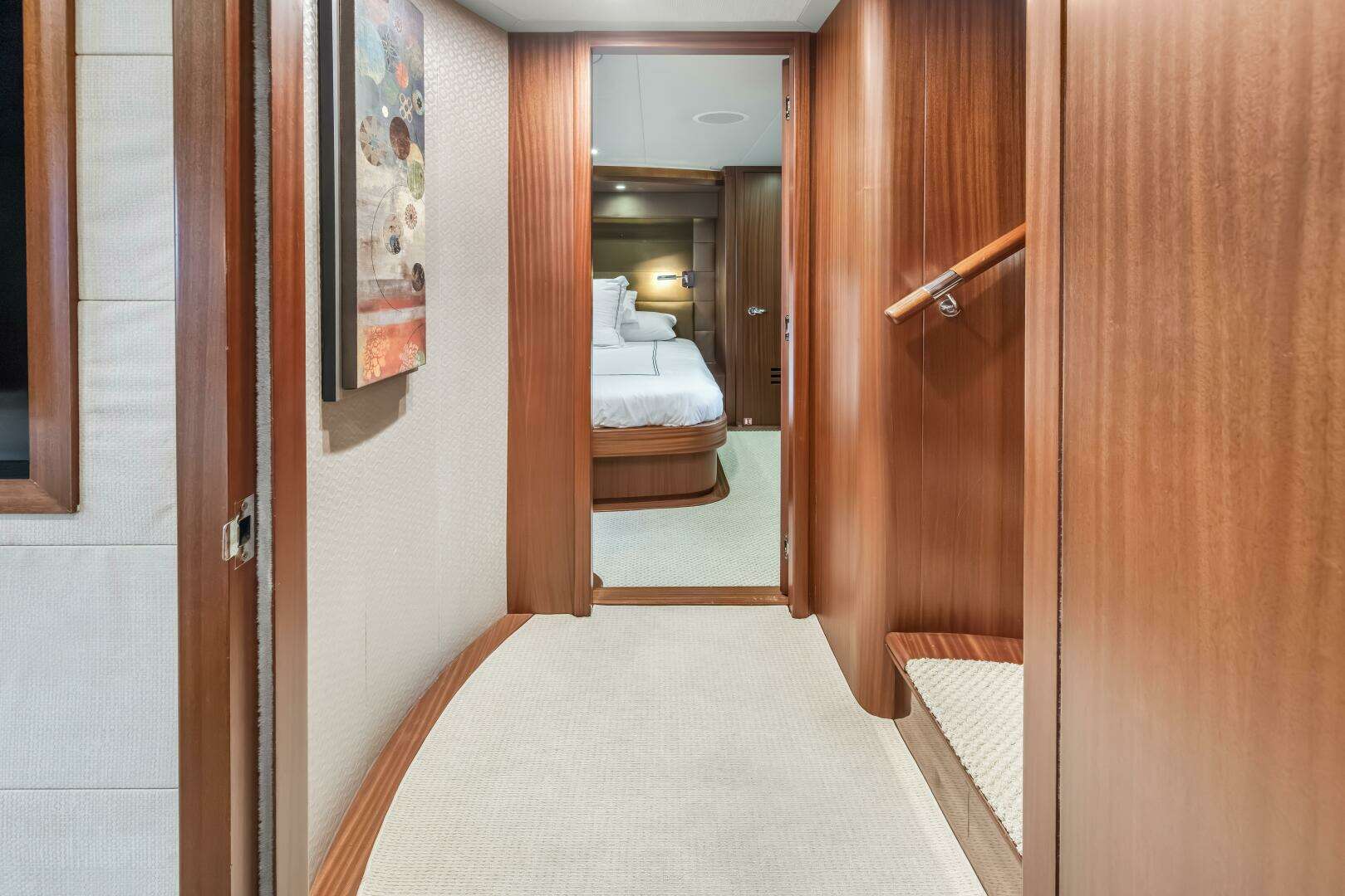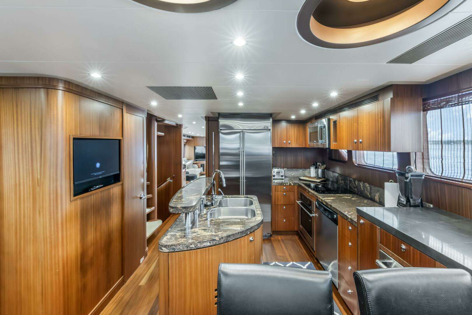 A sliding glass and stainless aft deck door leads to the main salon with plenty of comfortable and a large LED TV starboard. Forward in the salon is a round dining table to port and a full-service bar to starboard. Further forward on the main deck is a full galley with stainless appliances to port, a day head, and a spiral staircase down to the master stateroom and king guest stateroom. All the way forward on the main deck is a staircase down to the VIP queen stateroom.
