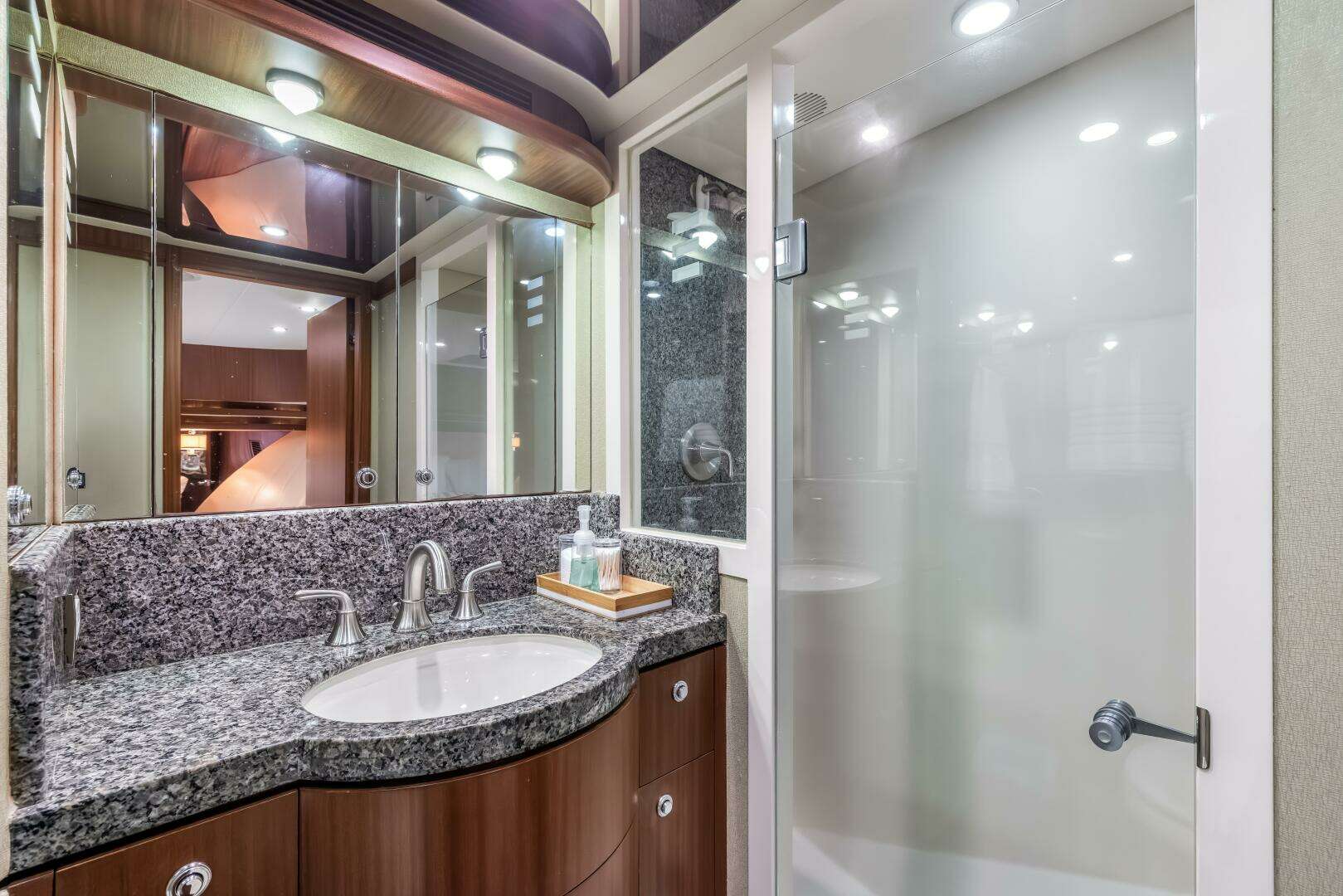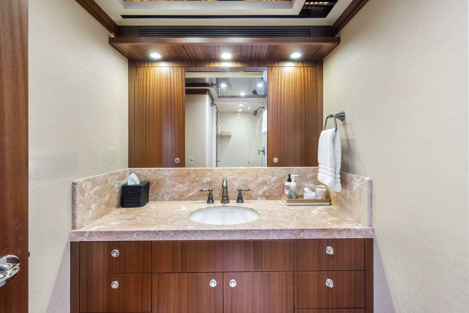 JUS CHILL’N is an impressive 84’ Cheoy Lee Bravo 2012 that has been professionally maintained by captain and crew. She is a must-see vessel in this size/price range due to many unique features like a country kitchen, spacious factory-built cockpit with stowed davit, a TNT lift, wide walkaround side decks, a high volume interior, air-conditioned flybridge with enclosure, and great performance with a 20kt cruise. The vessel features a three-stateroom layout with two full-beam king berths and one VIP queen berth. The crew quarters are located aft with two staterooms and a crew lounge.