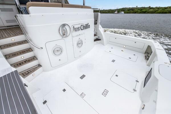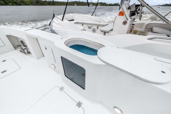 Starting aft on the transom you'll find the TNT lift which holds a 15' ZAR tender with 90HP outboard. The spacious factory built cockpit has an aquarium style livewell, chilled storage, and a prep station. This area can be shaded by adding a canopy and really compliment this space and close to the water for swimming and boating activities .