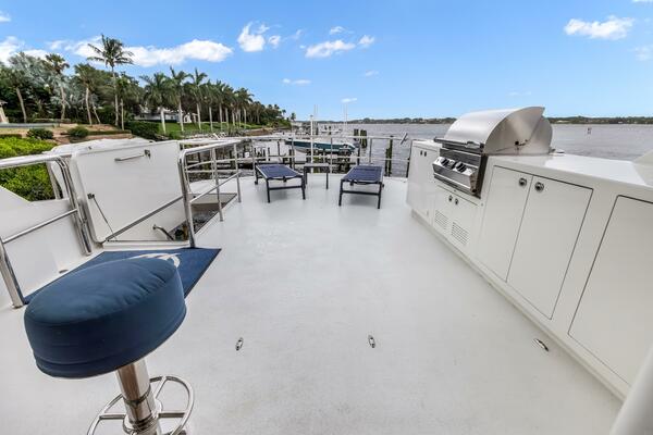 Forward up molded stairs (port and starboard) is the aft deck with one of the three dining spaces with a teak table, built in seating aft, and folding teak chairs. To port, there is a walk-up bar with refrigerator and stairs to the flybridge to starboard.