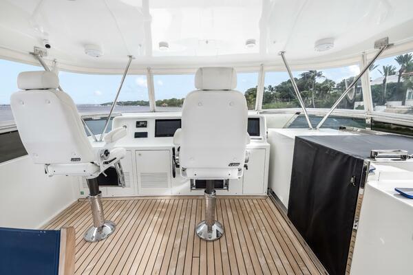 The flybridge can be accessed from either the staircase at the aft deck or a spiral staircase forward in the main salon. The flybridge features an air-conditioned helm, three-sided EZC2Y enclosure, two helm chairs, settee with table to port and a bar with three stools to starboard. Aft is a gas BBQ grill and a large open deck for setting up chairs and entertaining.