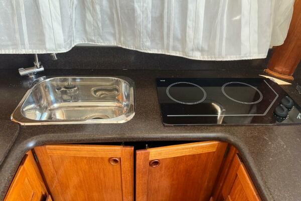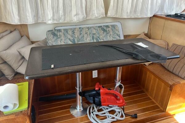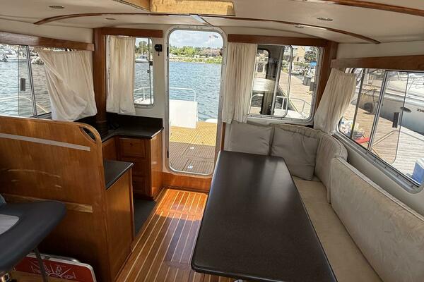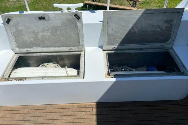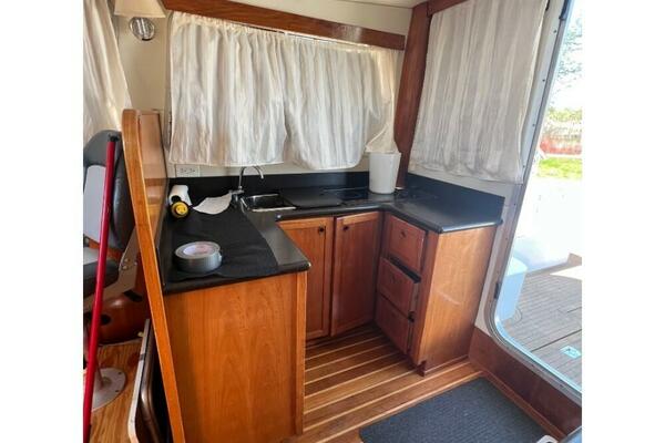 The interior and accommodation space are finished wood mahogany decking, cabinetry,