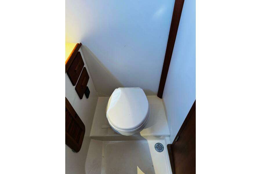 - Sealand Vacu-Flush electric marine head is plumbed to a 27-gallon aluminum holding tank and overboard discharge.