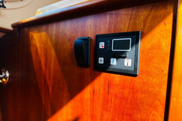 - Storage lockers under V-berth has easy-access cherry drop-front doors.