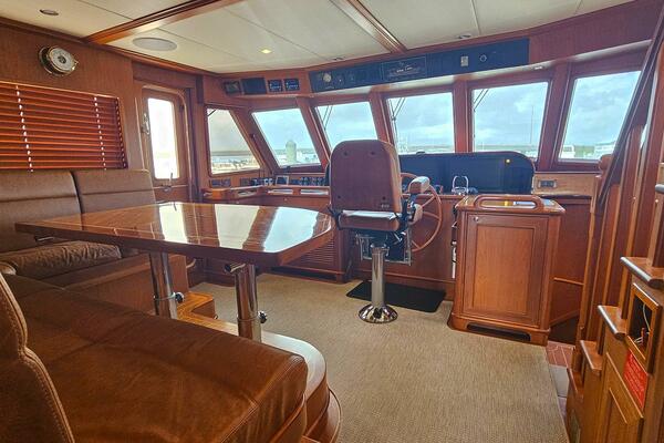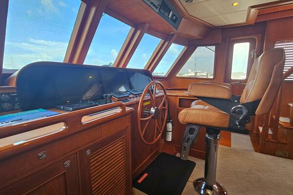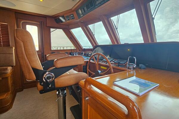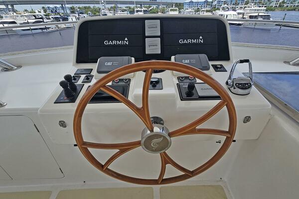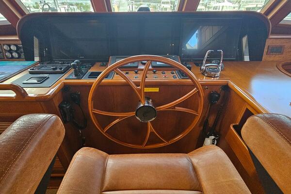 - Wood Outer Reef steering wheel at helm in pilothouse