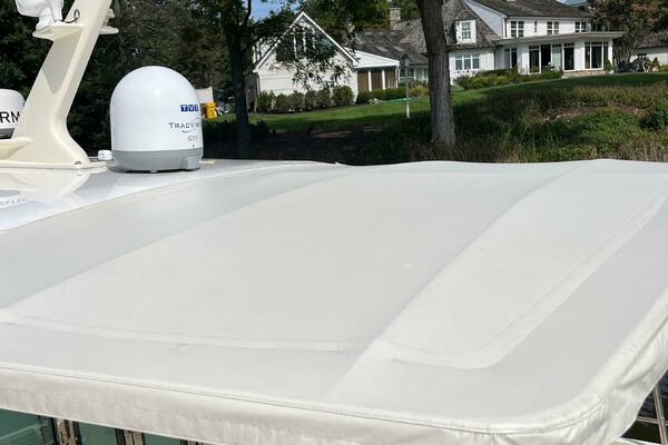 - Custom M Yacht services aft fixed cockpit cover that creates outdoor living space unique to this exceptional yacht