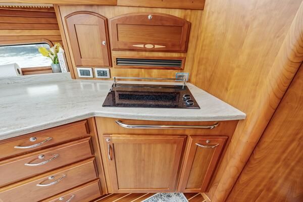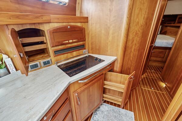 Down a few steps from the salon is the galley, with extensive storage and cabinets plus in floor storage - enough to stock easily for a 2 week trip or more.