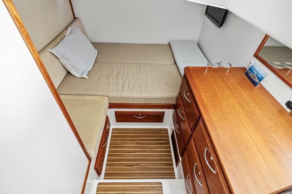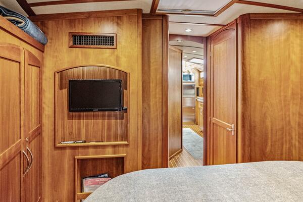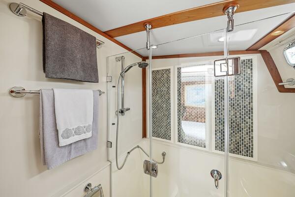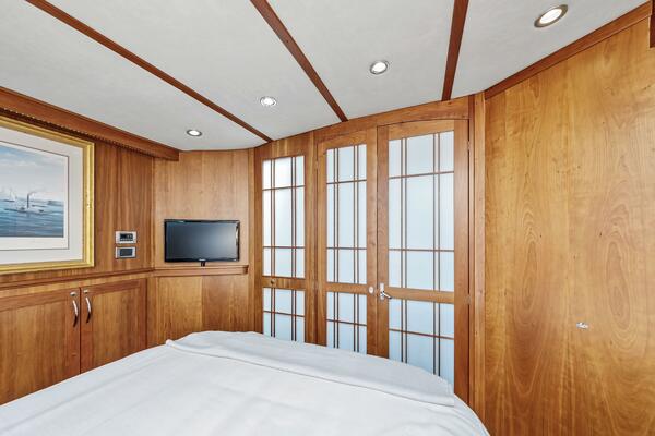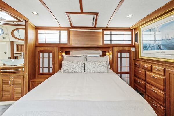 The master is across from the galley, with beautiful shoji doors, a walk around master berth with hanging lockers and drawers abound. Natural light via the port holes that can be closed for privacy and sleeping. The private ensuite head has a desirable vessel sink on top of a cherry cabinet with a walk-in stall shower.