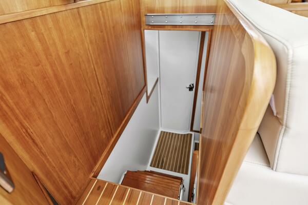 Going forward from the galley, the companionway has a privacy door to close off the VIP Stateroom and day/guest head for when one has overnight guests.